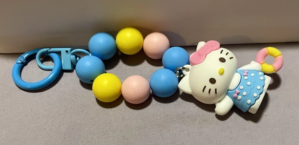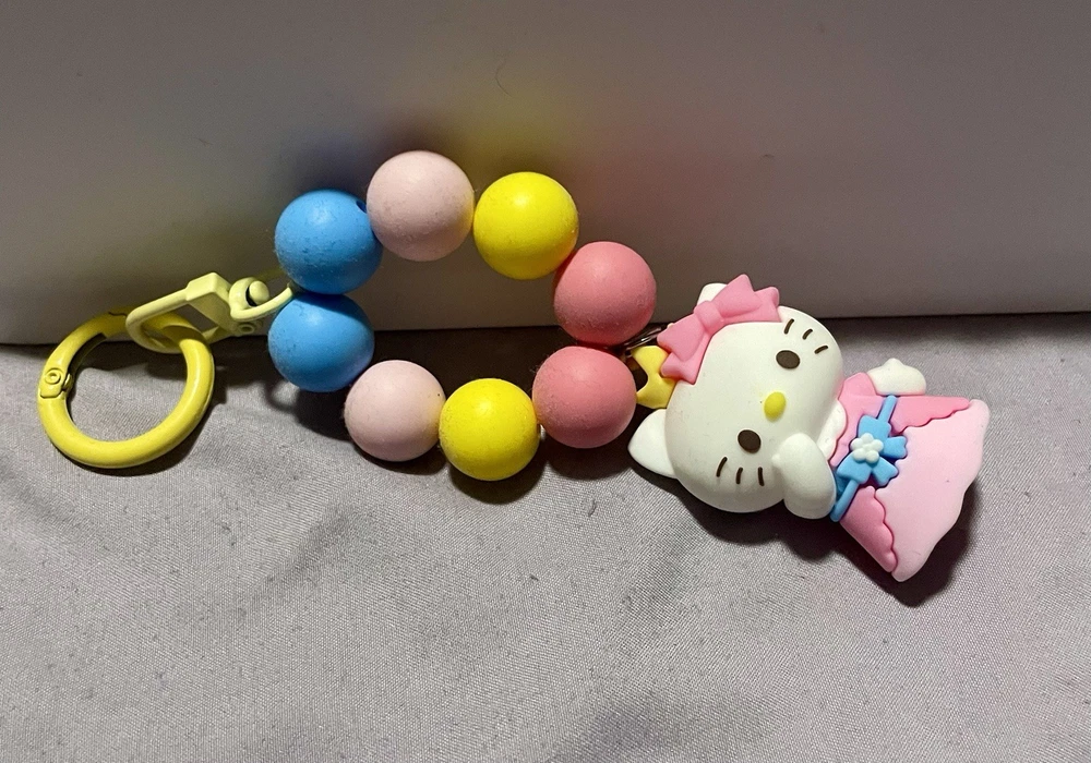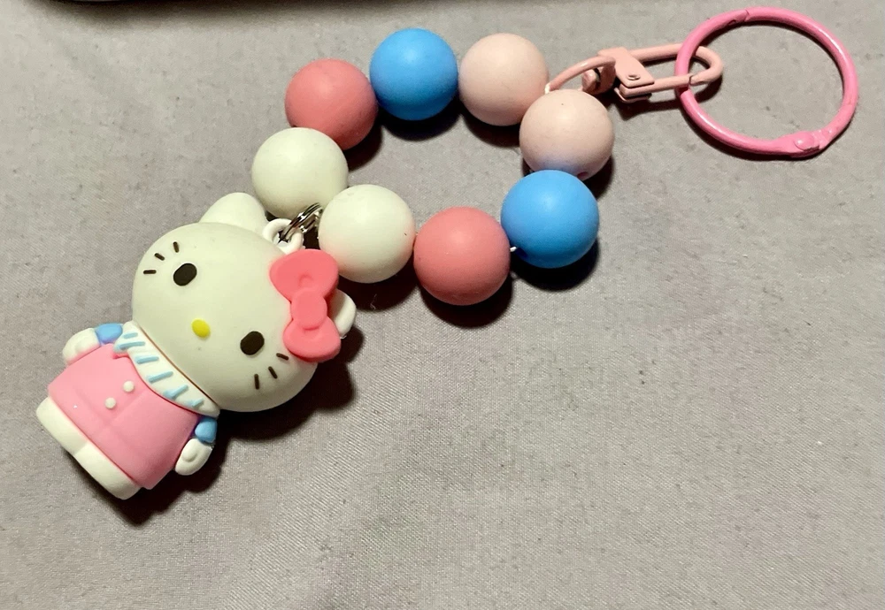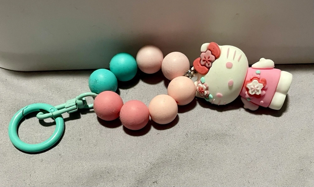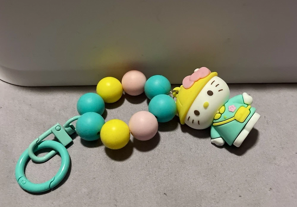 The product is a handmade wristlet keychain featuring Hello Kitty, designed specifically for women. The keychain is multicolored, adding a fun and vibrant touch to accessory collection. With its unique design and brand of being handmade, this keychain combines functionality with a playful and feminine aesthetic, making it a stylish addition for any fashion-forward individual.