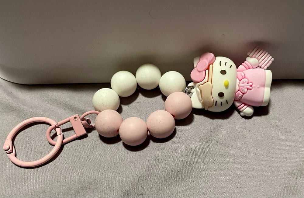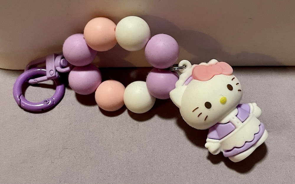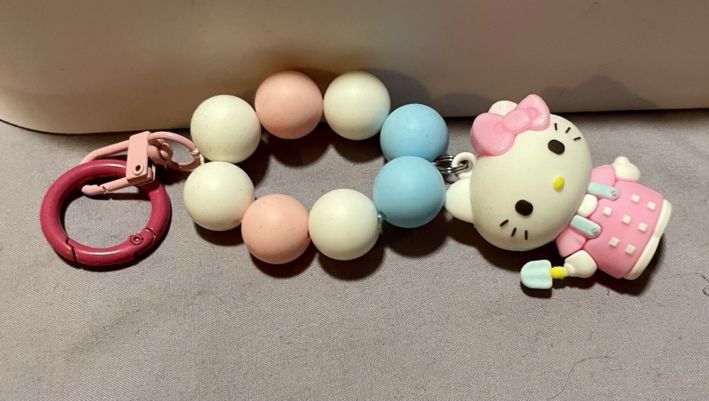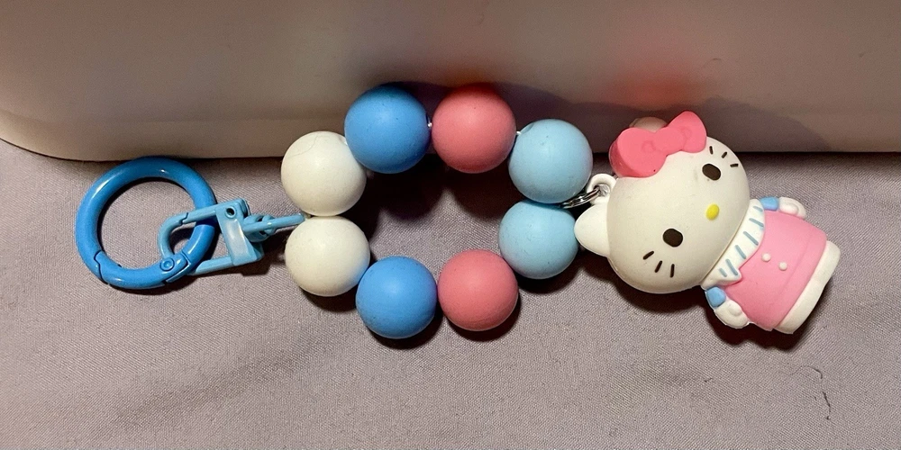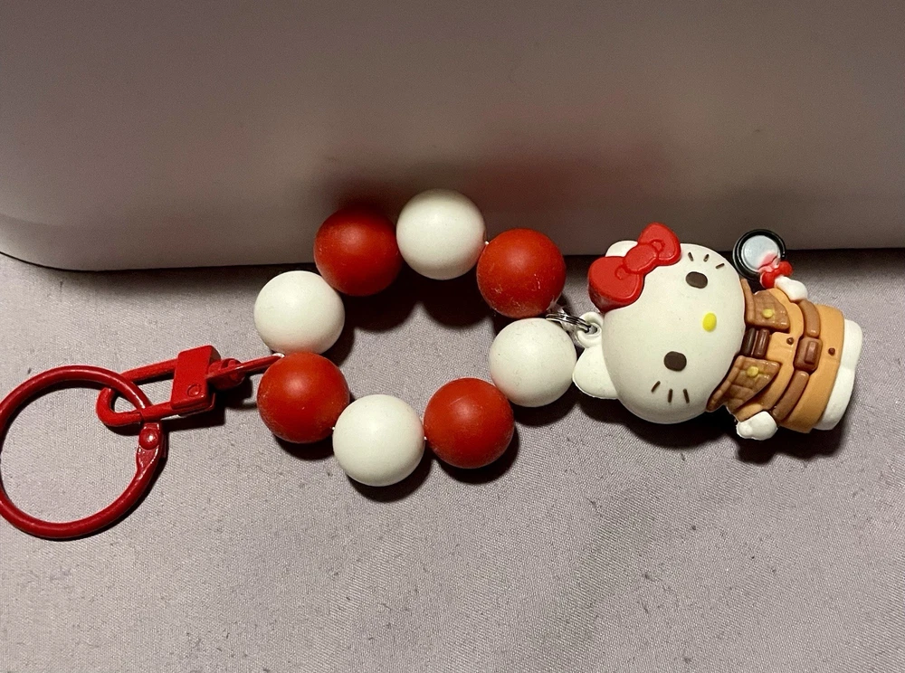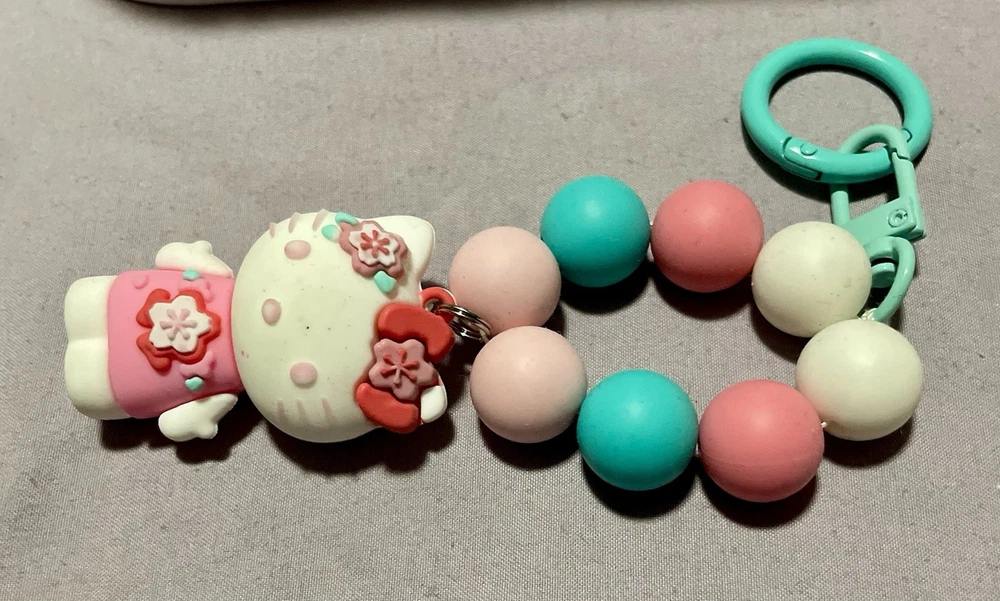 The product is a handmade wristlet keychain featuring Hello Kitty, designed specifically for women. The keychain is multicolored, adding a fun and vibrant touch to accessory collection. With its unique design and brand of being handmade, this keychain combines functionality with a playful and feminine aesthetic, making it a stylish addition for any fashion-forward individual.
