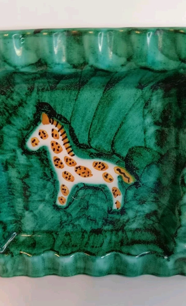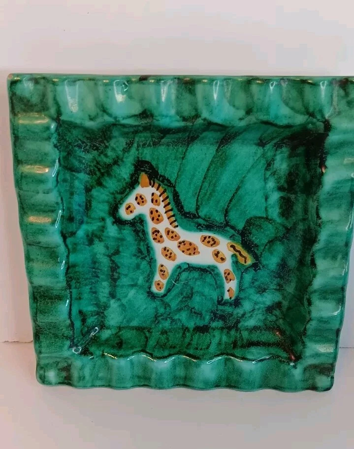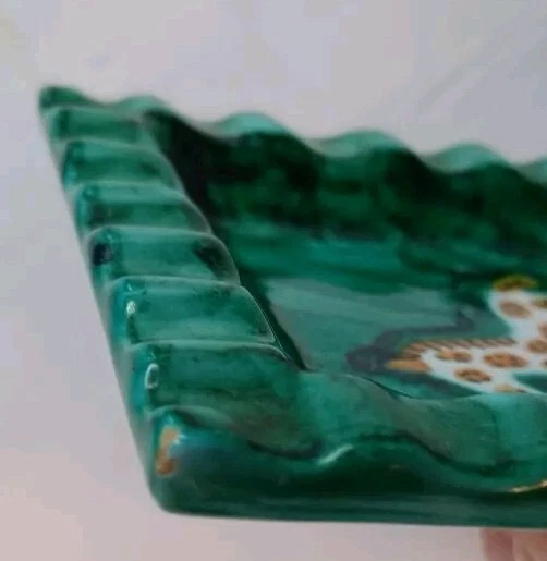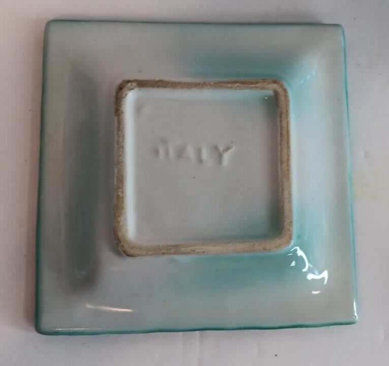 This adorable dish marked Italy measures 4"square and has crimped edges. There is a small chip on one corner; please see all photographs as they are part of the description. Shipped with USPS Ground Mail. CB999