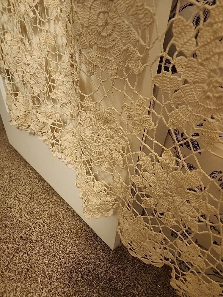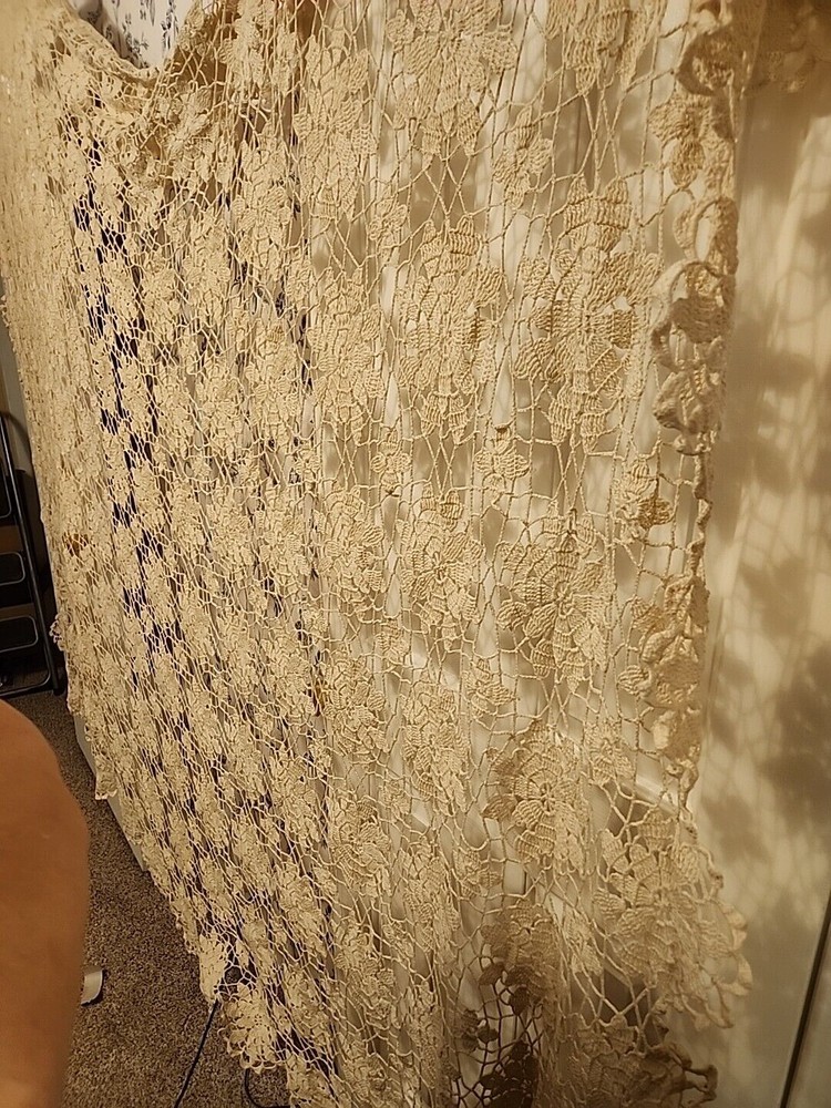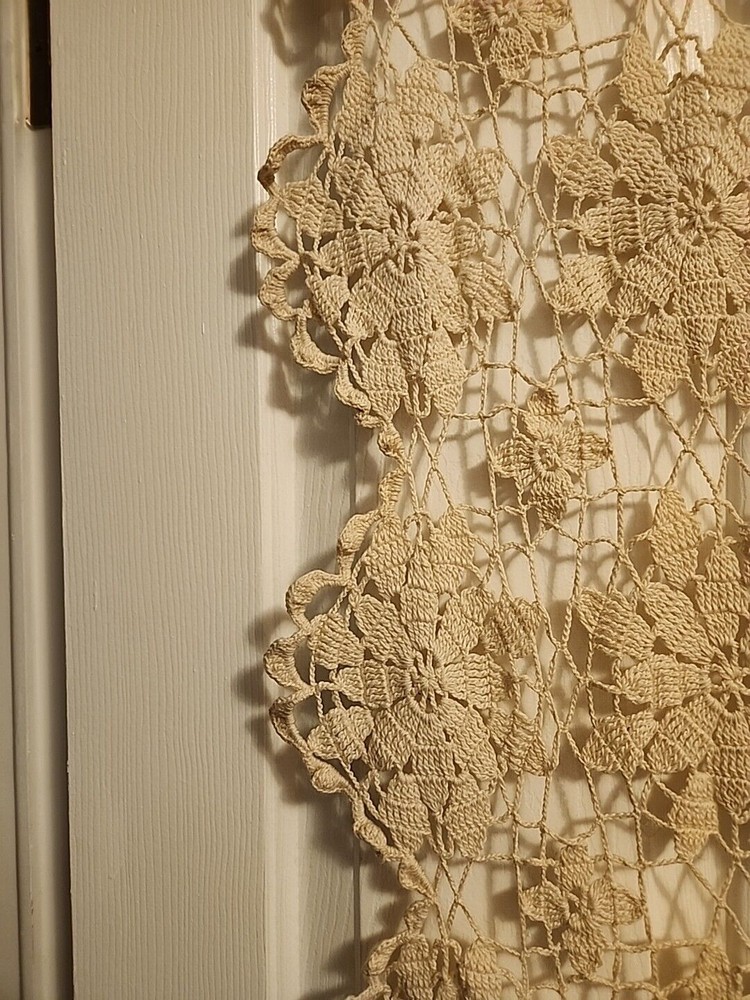 This is truly vintage, AMERICAN MADE by an American grandmother, crocheted tablecloth. The pattern is Queen Anne's Lace Tablecloth Pattern (#7050 on Freevintagecrochet.com) It is a beautiful ivory color, An open weave pattern. It would drape well on a 7' x 5' dining room table. The wood grain will show through nicely. I dont know the age of this one, but it has been well taken care of, and the thread is still strong. It will bring a nostalgic atmosphere into your home. Sigh... Listing and template services provided by inkFrog