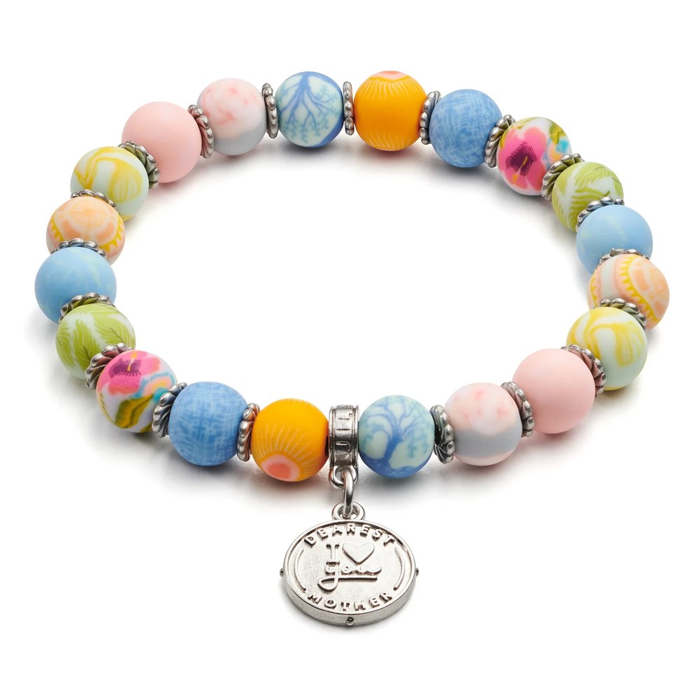 PEOPLE WE LOVE - MOTHER MOM Handmade Designed Clay Bracelet by JILZARAH Description: 8mm handmade clay beads. Antique finish silver spacers. Confidence, Hope, Strength, Patience, Love, Support, Guidance, Kindness. I love you Dearest Mother Charm. Notecard to write a special message. Strung on 1.2mm industrial strength elastic cord. 6.75" - 7" diameter. FREE SHIPPING!!! *JILZARAH Beads are handmade from smooth layers of clay, slowly rolled down to size while keeping the design. The clay is then rolled by hand into beads and made into beautiful designs. *JILZARAH Beads can be cleaned with hot water and laundry detergent. Use a small tooth brush to scrub clean and dry with a soft cloth. ***Buy your JILZARAH Beads from an official JILZARAH Bead dealer!*** Thank you for looking!!! CHECK OUT OUR EBAY STORE FOR MORE SELECTIONS!