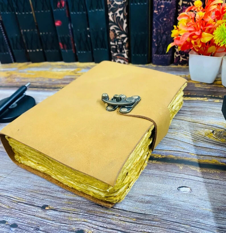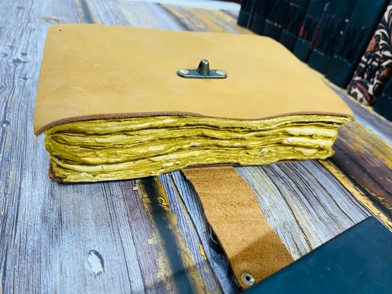 Leather Journal Notebook - 400 Page Handmade Sketchbook & Writing Diary Unleash your creativity and capture your thoughts in timeless style with this handmade leather journal notebook . Whether you're a writer, artist, traveler, or dreamer, this rustic journal is the perfect companion for your everyday inspiration. Features: 📖 400 Pages of Rustic Charm Filled with 400 pages (200 sheets) of thick, eco-friendly, unlined handmade paper, ideal for writing, sketching, journaling, or scrapbooking. 🧵 Handcrafted Beauty Each journal is carefully hand-stitched, featuring genuine leather with a natural, vintage finish. No two pieces are exactly the same – making your journal truly one-of-a-kind. ✒️ Versatile Use Perfect as a diary, sketchbook, travel journal, poetry notebook, or dream log. Works well with most pens, pencils, charcoal, and light watercolors. 🔒 Secure Wrap Closure A classic leather strap wrap keeps your journal safely closed and gives it an authentic old-world feel. 📐 Ideal Size Portable and practical – great for daily carry, travel, or bedside reflections. (Provide size here, e.g., 7x5 inches or A5, if known.) Why You’ll Love It: This journal isn’t just a notebook – it’s a space for your imagination to roam free. Whether it’s your next story, sketch, or moment of clarity, it deserves a beautiful place to live.