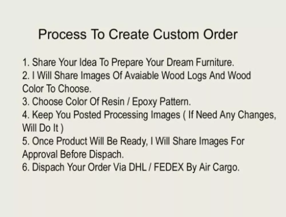 Table Top Size: 36"x24" Inches Our epoxy tables are custom-made, and we strive to use the same type of wood as depicted in our advertising pictures. However, it is not always possible to find an exact match, which may result in slight variations in the epoxy color and wood grain pattern. It's important to keep in mind that the table you receive may not be an exact replica of the advertising picture. We ensure that our clients are informed of every step of the process, from the selection of the wood to the final finish of the table. We keep our clients up-to-date throughout the process to ensure transparency and avoid any misunderstandings. Additionally, our price includes air delivery right to your doorstep via DHL/Fedex/UPS and insurance protection. Please note that you may be responsible for paying any applicable tax and duty on delivery. If you have any concerns or doubts, we highly recommend addressing them before making a purchase. Clearing any doubts beforehand will help avoid any issues and ensure a smooth buying process. It's important to note that any accessories depicted in the advertising images, such as knives, chairs, or lighting, are not included with the product and are only used for photography purposes. Additionally, please keep in mind that the price of the product does not include any type of legs. If you would like legs included, we can provide them for an additional cost. We recommend addressing any questions or concerns before making a purchase to avoid any misunderstandings.