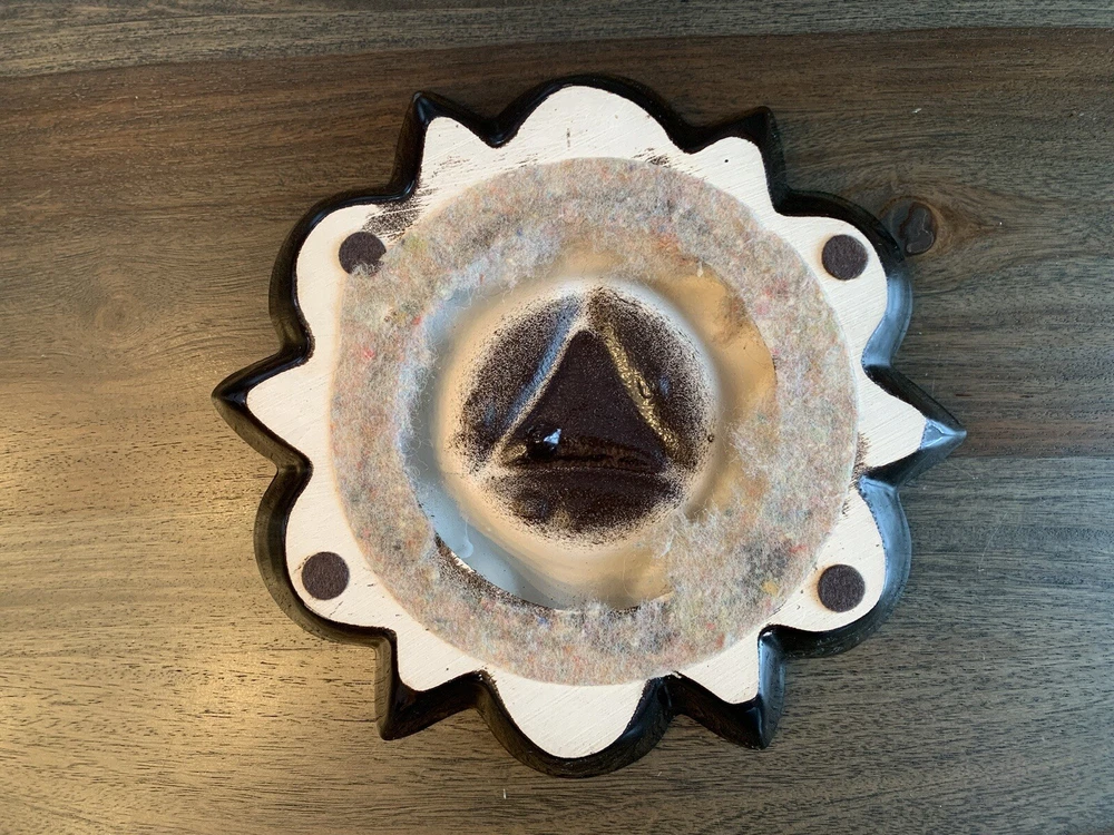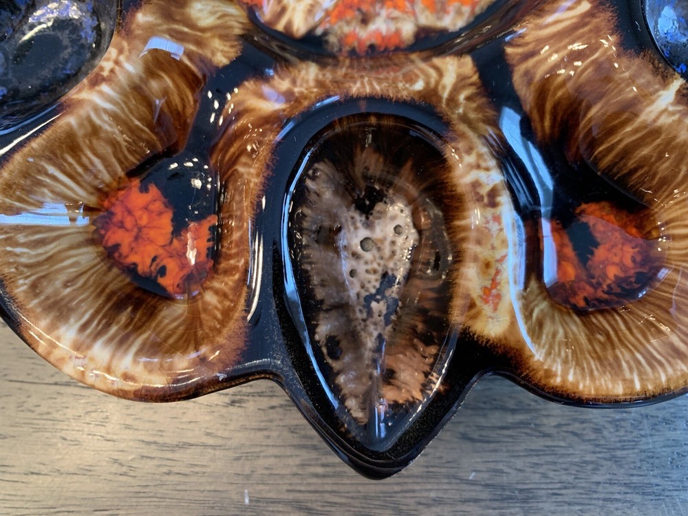 Original handmade decorative plate featuring stunning rich colors. In good condition, shows normal wear consistent with age and use like chips on the rim as depicted in the pictures. Please refer to the pictures as they’re part of the description. Measurements: - Length: 22.5 cm - height: 3.3 cm - width: 21.8 cm - weight: 600 g