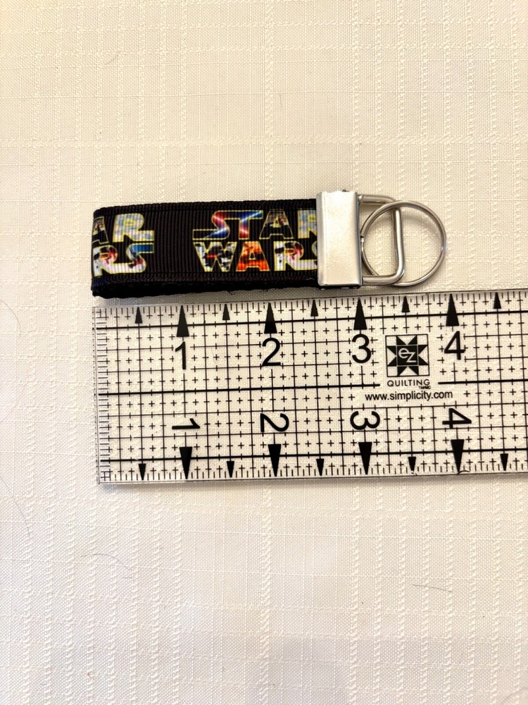 Handmade MINI Key Fob Wristlet made with multicolored "STAR WARS" on black grosgrain ribbon sewn onto black webbing. Design placement on ribbon may vary. Length without hardware loop and ring is about 3 inches long and 1 inch wide. Hardware and split ring has a nickel finish. Fun backpack, zipper pull, luggage tag. More Pacifier holders and Key fobs available in my store. Free Shipping!