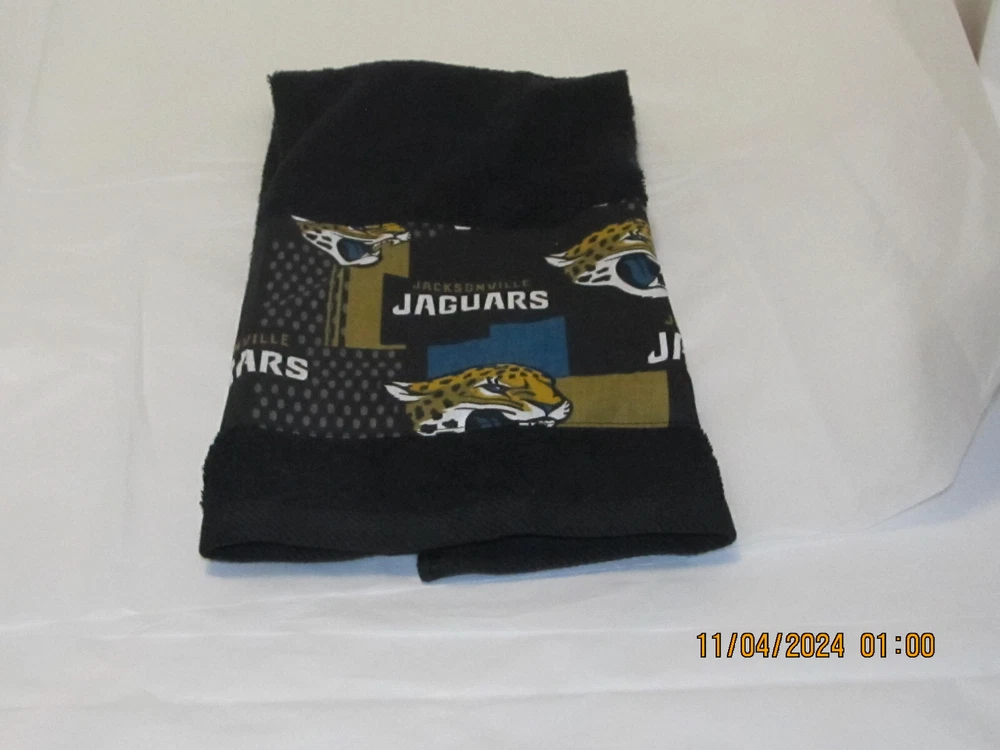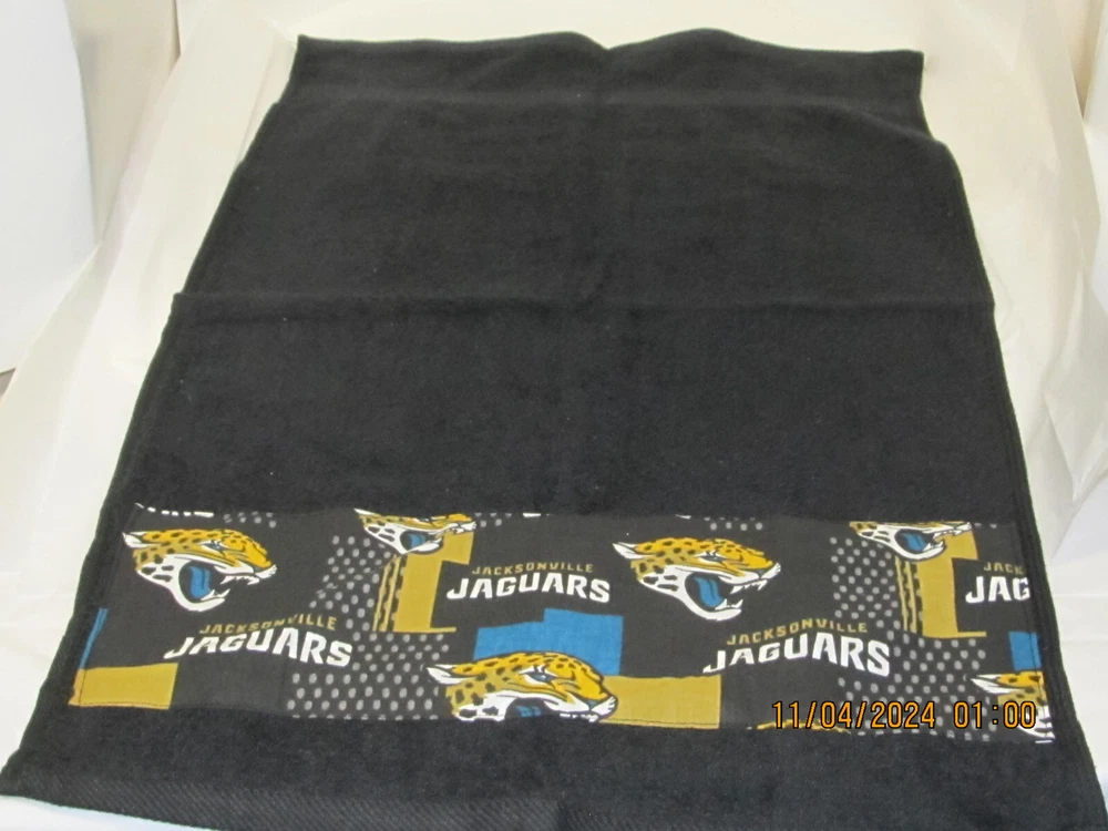 This is not a licensed NFL product. It is however, hand-crafted from licensed NFL fabric. I am not affiliated with or sponsored by the NFL. Tabberone.com Towel Hub towel measures approximately 16 1/4" x 25 1/2" Fabric on towel measures approximately 5" L x 15" W These towels are perfect for the gym, kitchen, spa, and the bath New fast drying towels Towels are made and imported from Pakistan Wash before using. Machine wash in cold water. Wash with like colors. Use non-chlorine bleach when needed. Tumble dry low. Handmade and sewn with love in the USA by Diane Handmade items, not licensed by the owners of the characters depicted. Team fabric is 100% Cotton First Quality Fabric Limited quantities Made in a smoke free home This is not a licensed NFL product. It is however, hand-crafted from licensed NFL fabric. I am not affiliated with or sponsored by the NFL. Tabberone.com