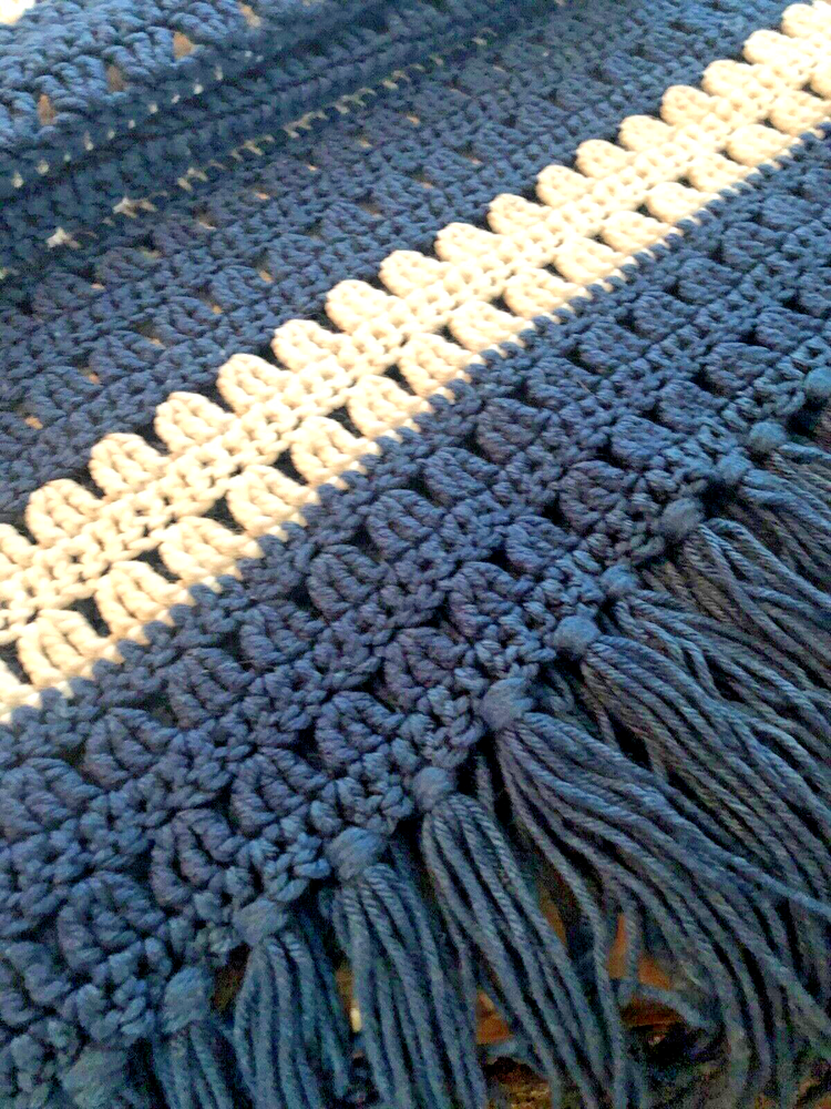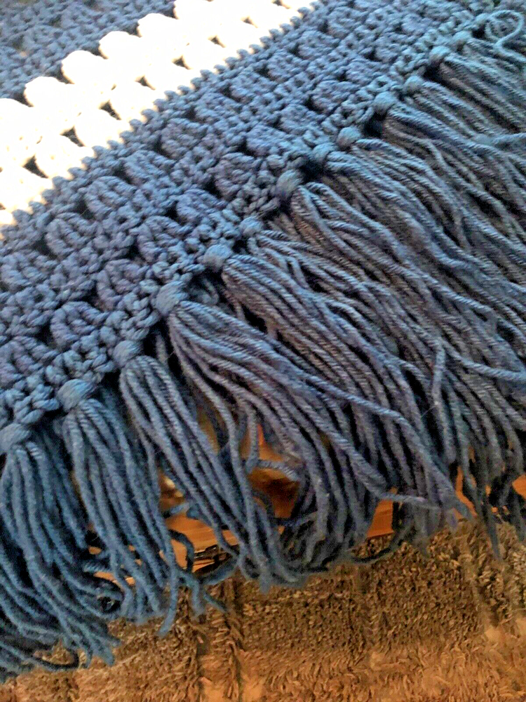 Experience the cozy charm of this artisanal Handmade crochet throw, perfectly blending navy blue and white to create a timeless nautical theme. It's an ideal size of 42x58 inches, making it a versatile piece for draping over furniture or snuggling up on chilly evenings. The intricate crochet/knit craftsmanship is evident in every stitch, offering both warmth and a touch of artisanal elegance to any space.This throw's features include a stylish fringe detail, adding a contemporary edge to its classic design. Whether you're accenting your living room or adding a splash of color to your bedroom, this blanket is not just a functional piece but also a decorative element that enhances your home's comfort and aesthetic.