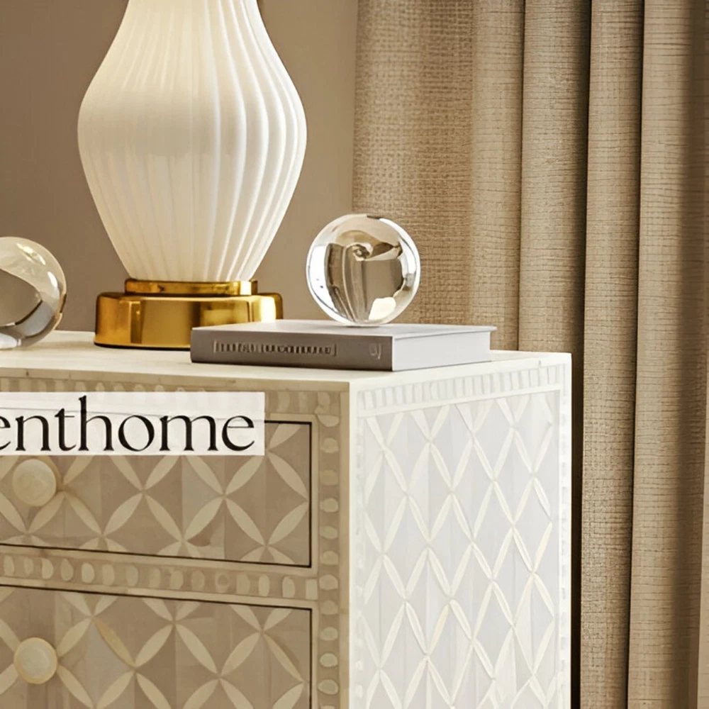 This stunning cabinet is a perfect blend of art and function! The intricate geometric bone inlay adds a luxurious touch, while the off-white resin base keeps it elegant and versatile. Handcrafted with care, it brings artisan charm to any space. The three spacious drawers are super practical, making it as useful as it is beautiful. A true statement piece that elevates any room effortlessly!