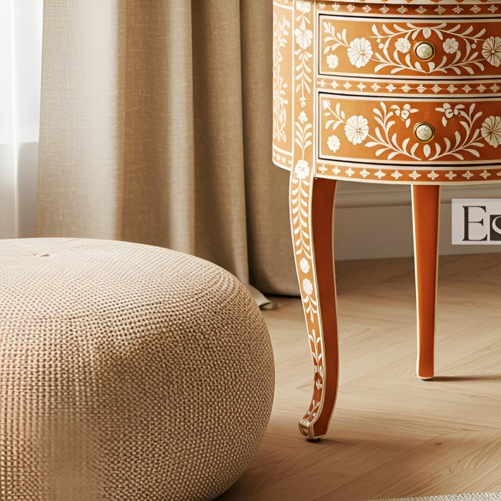 This gorgeous end table is a showstopper! The vibrant orange floral inlay pops against the rich red base, adding a luxurious touch to my living room. The craftsmanship is incredible—you can see the attention to detail in every curve and pattern. The two drawers are super handy for storing remotes or small items while keeping everything looking tidy. It’s the perfect blend of art and function—I get compliments every time someone visits!