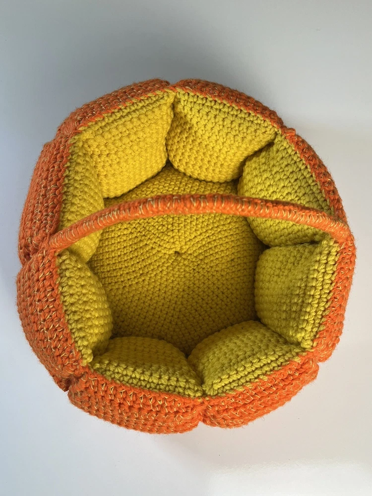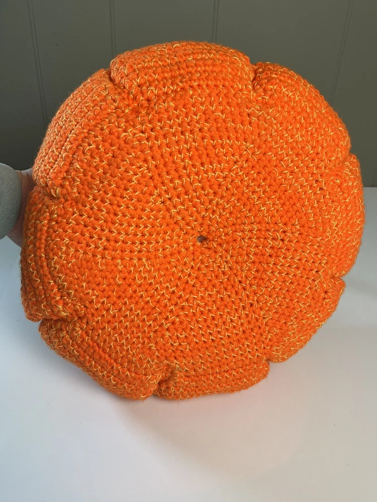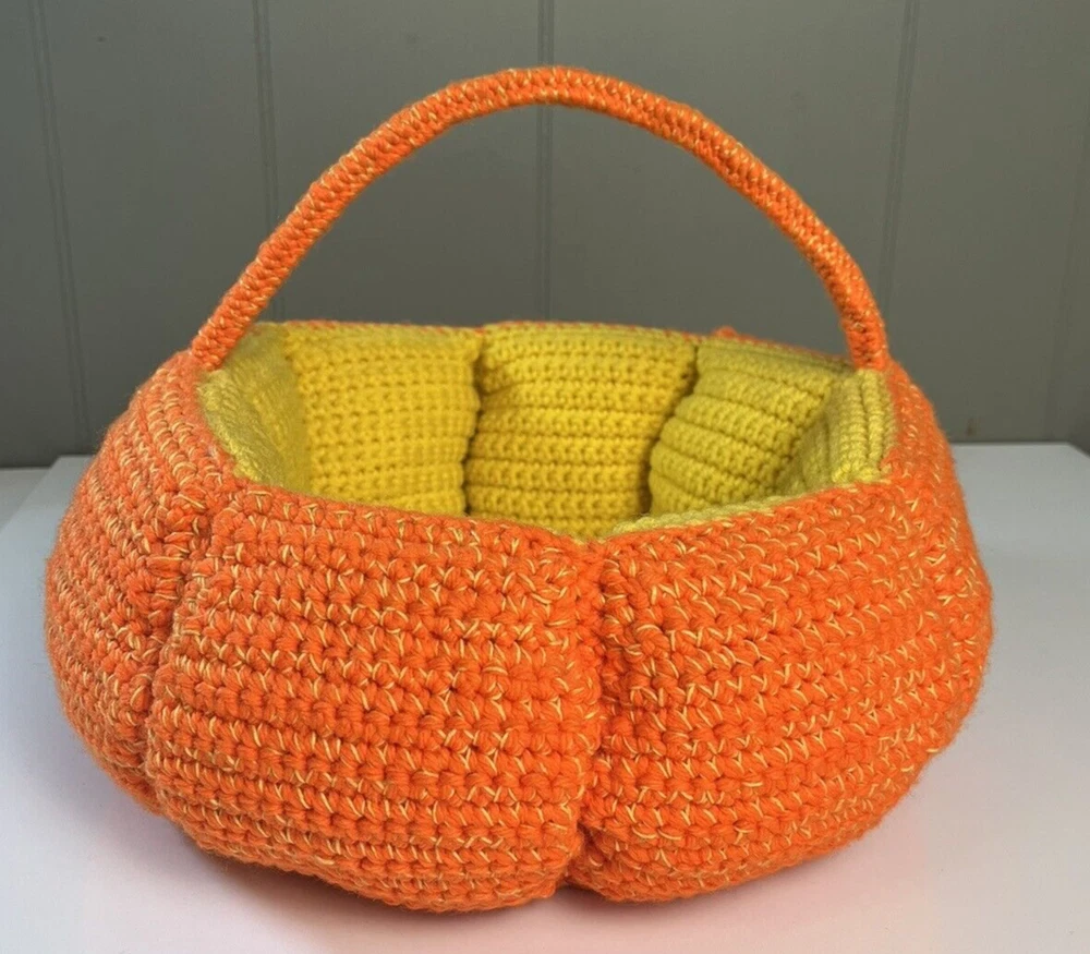Handmade PUMPKIN BASKET Knit Crochet 12" Table Decor Halloween Fall Thanksgiving Excellent condition. Measures approximately 12" round. The sides are about 5" tall & the height of the entire basket including handle is about 8". Please review all photos for best description. Feel free to send a message with any questions. Thanks for looking:) Inventory: B