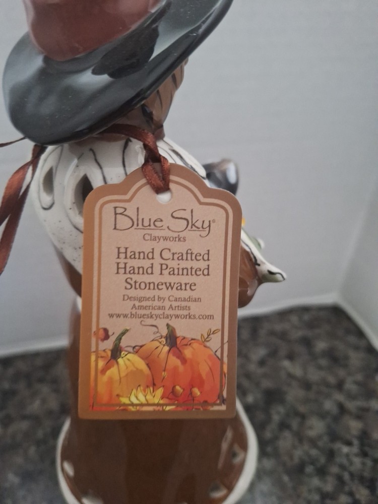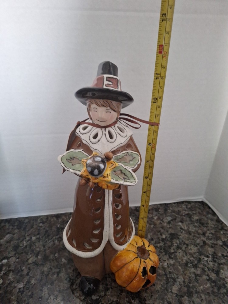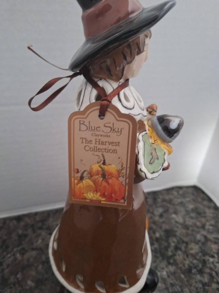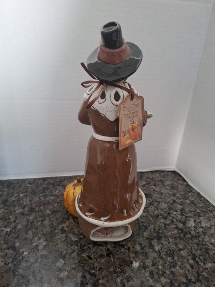 Holiday:ThanksgivingObject:Tealight HolderMaterial:PorcelainSize:11' Tall x 5.5' WideNew:New with TagSubject:Pilgrim w/ PumpkinModified Item:NoHandmade:YesPersonalize:NoArtist:Heather GoldmincOccasion:ThanksgivingYear:2010Color:BlueCountry/Region of Manufacture:United States