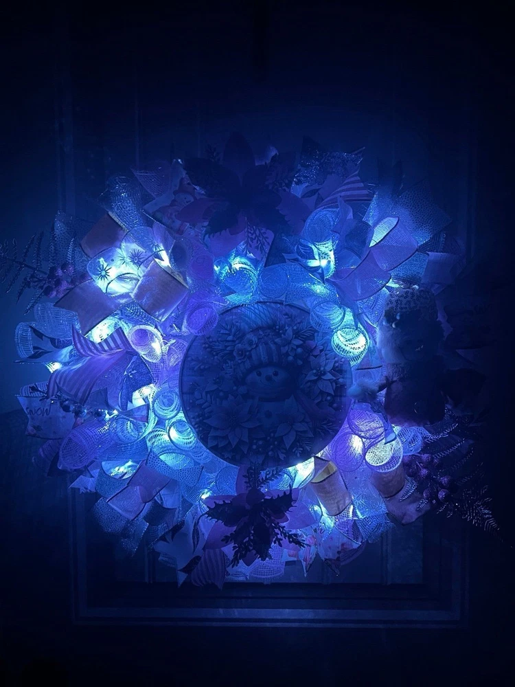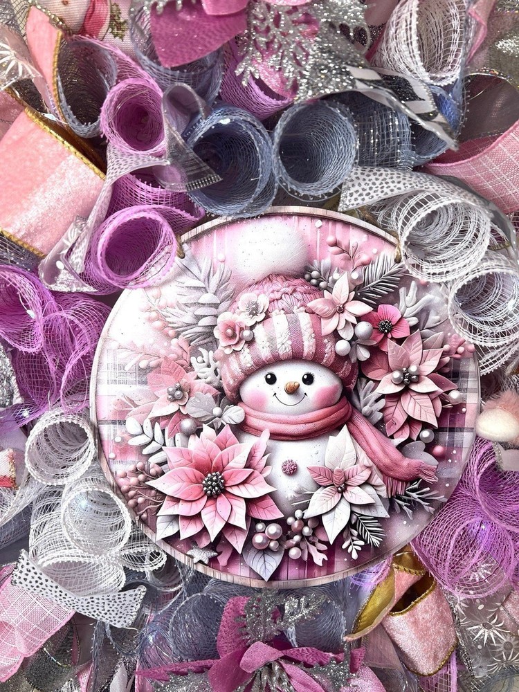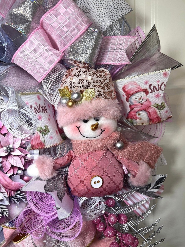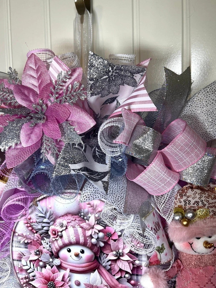 About 22 inches, 5 inch-deep door or mantle wreath. Pink, White, and Silver mesh back. December/ Christmas themed w/ vibrant multi color wired ribbons (9 styles). Has a Pink Snowman/ Poinsettia wooden sign, a mini plush, glitter berries, faux poisettias and silver leaf spray adorn this wreath This wreath is built on a 14 frame. Perfect for decorating your home for Winter/ December Holidays/ Christmas . Fitted with 20 LED lights to illuminate at night; 3 modes. Wreath made in a smoke free environment. Wreath can be displayed either indoors or outside. However, for optimal durability please avoid direct sunlight and harsh elements. Ships in a sturdy box that will be closer to frame size. On arrival you may need to fluff ribbons and bows so it will be ready to beautify your door or mantle. Please be aware, deco mesh has a tendency to fray at the edges. Simply trim any loose strands to preserve the beauty of the wreath. W80Ch13D218939COP