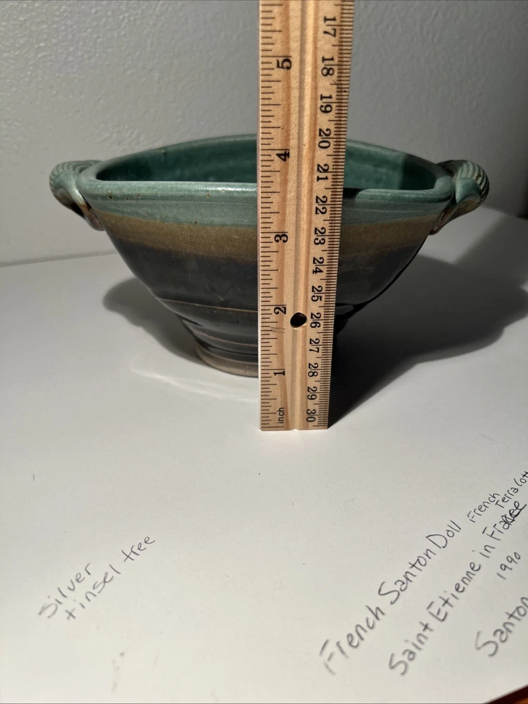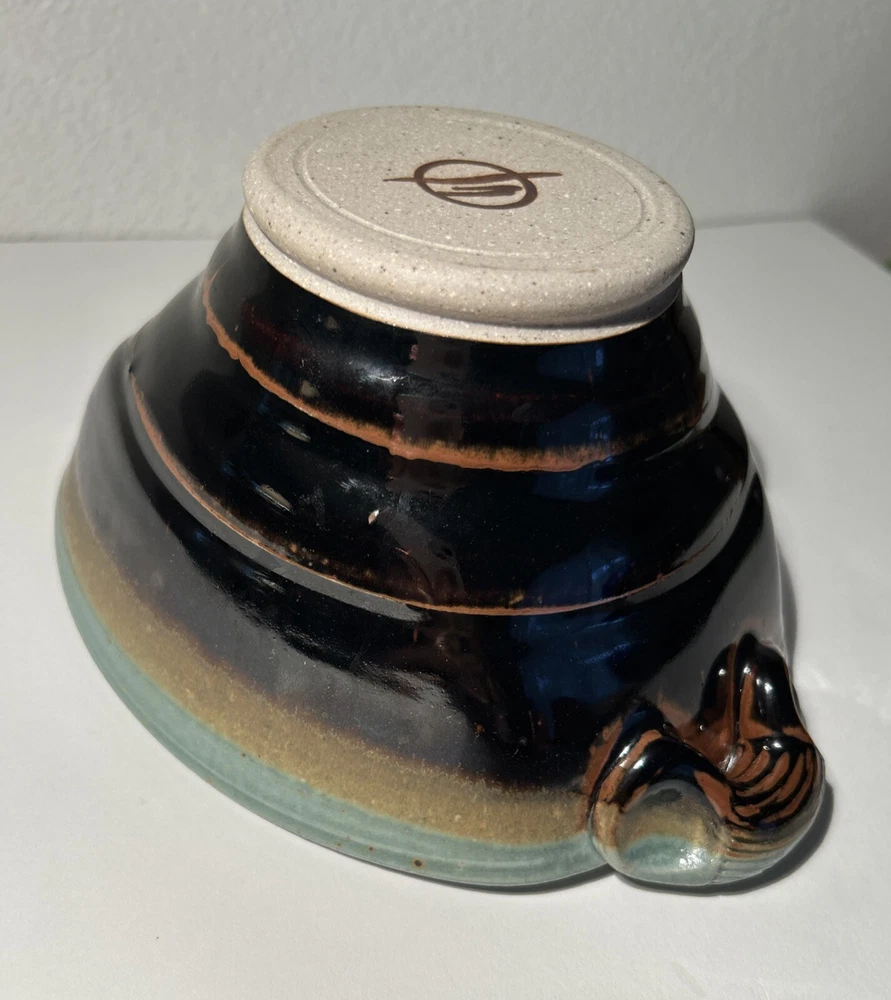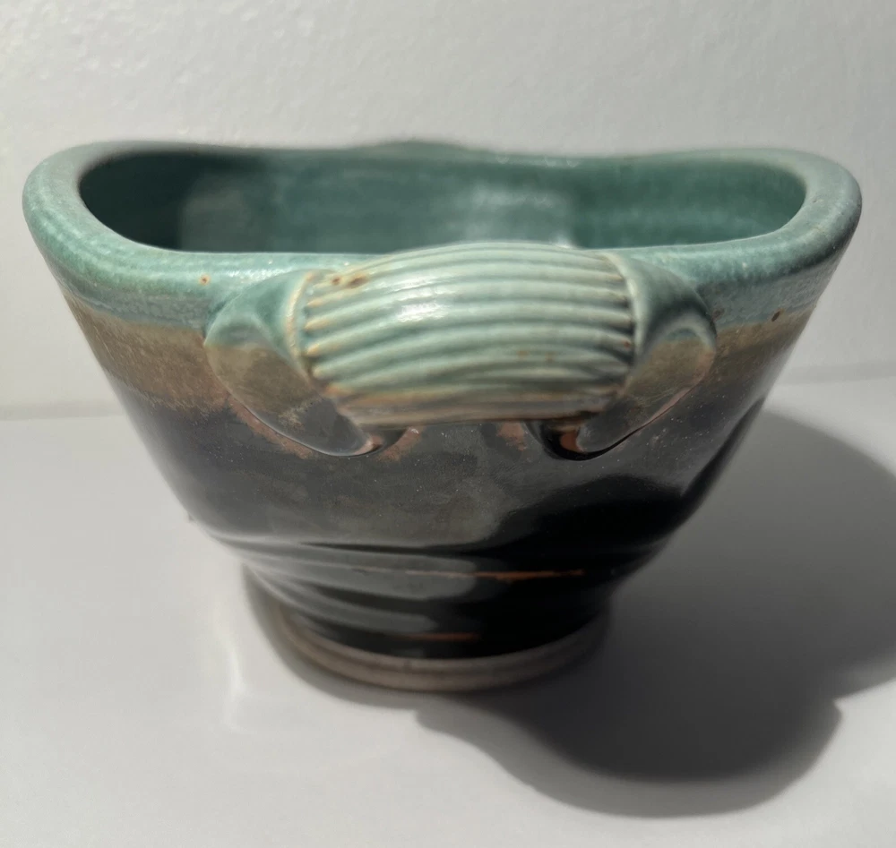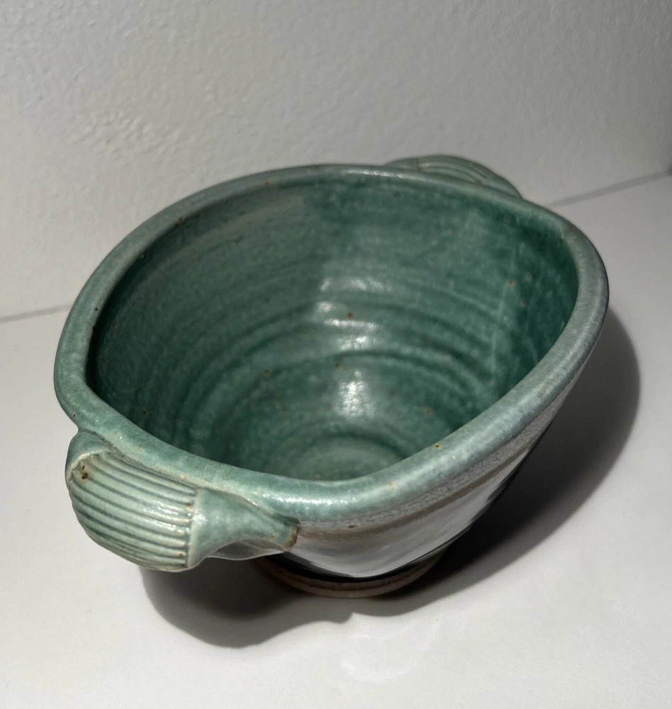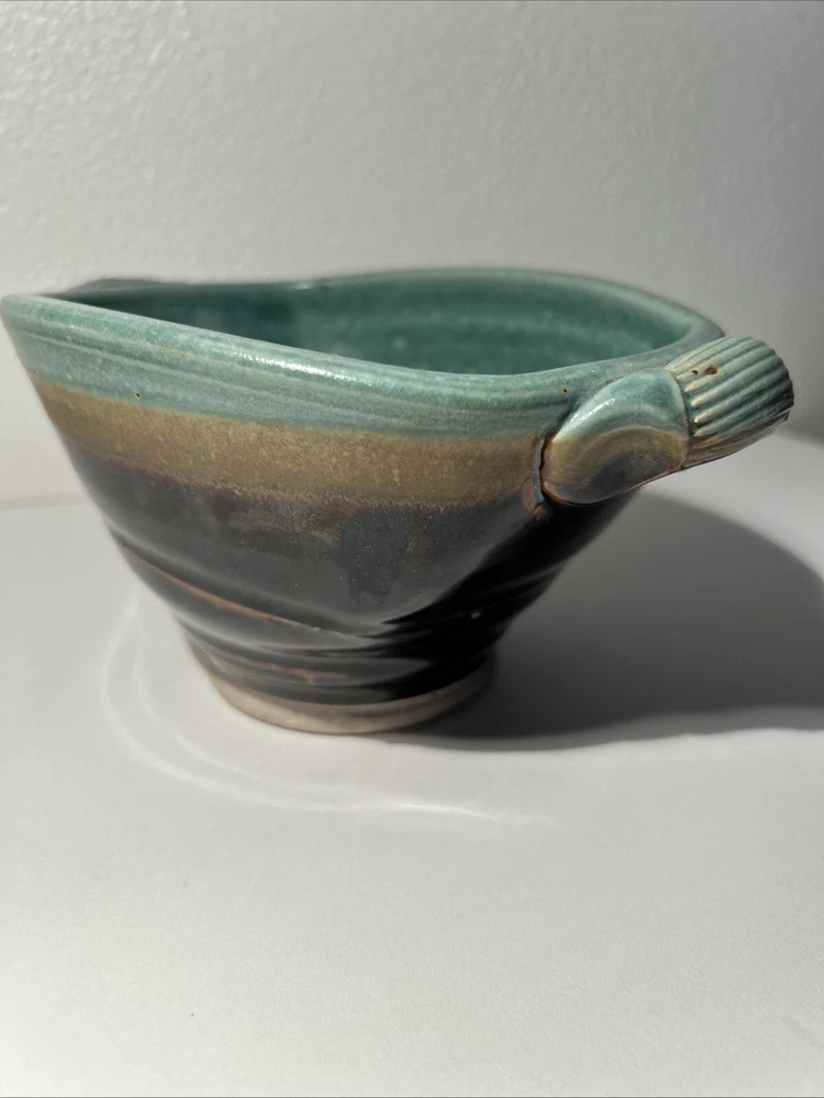 This is a handmade pottery bowl originating from North Carolina. It is an original piece, not a reproduction, with a production technique of pottery. The bowl has a mixed matte and gloss finish, showcasing a unique design. Measuring 3.5 inches in height and 7.25 inches in length, it weighs 1lb 3oz. This vintage-inspired piece adds charm to any kitchen or dining setting with its artisanal craftsmanship.