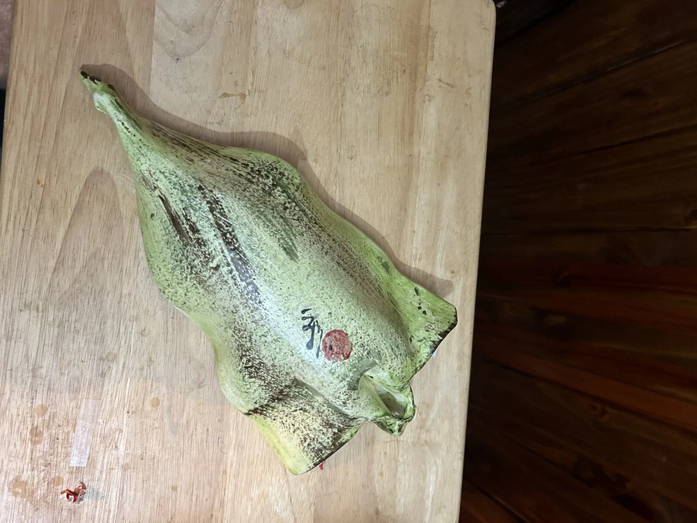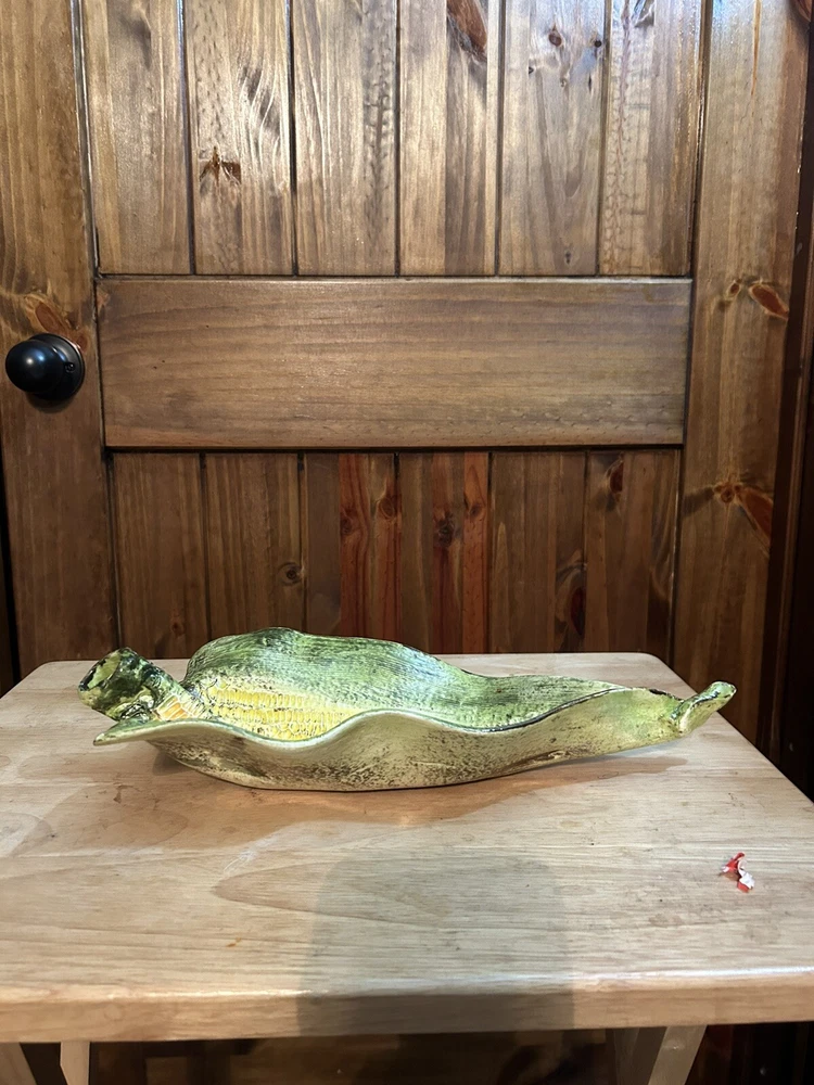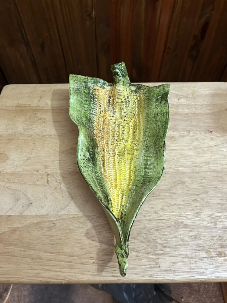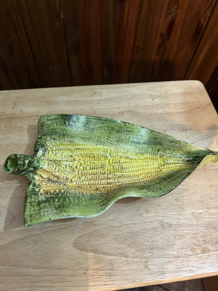 This beautiful serving bowl is a one-of-a-kind piece of art, handcrafted by skilled artisans using stoneware and pottery techniques. The intricate corn cob leaf texture adds a unique touch to the design, making it perfect for serving your favorite dishes. The bowl is in great shape and has been gently used, adding to its charm and character. It is an ideal addition to any pottery and glass collection, and will be a wonderful conversation piece at your next dinner party.