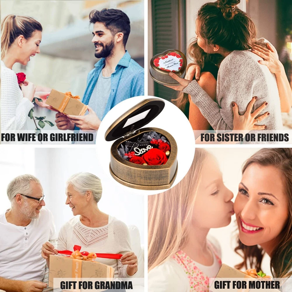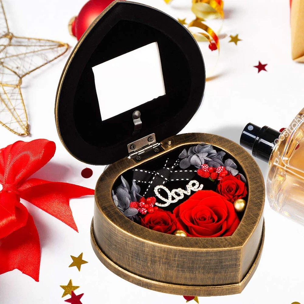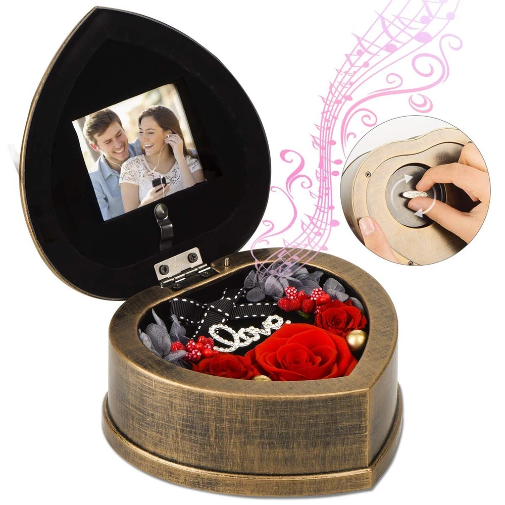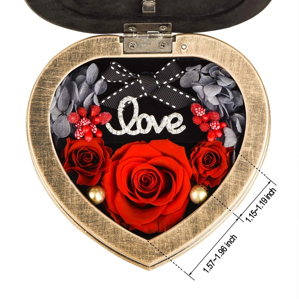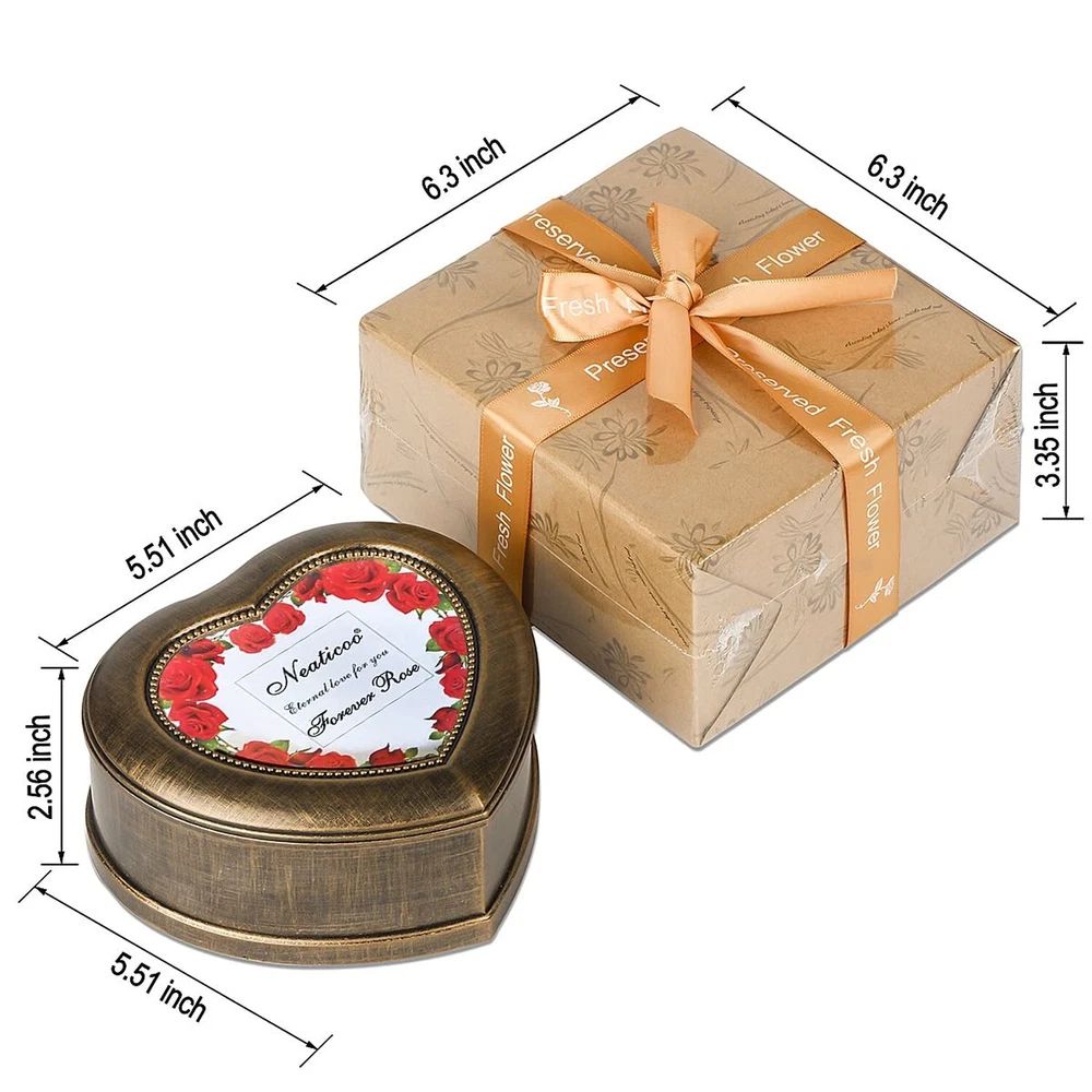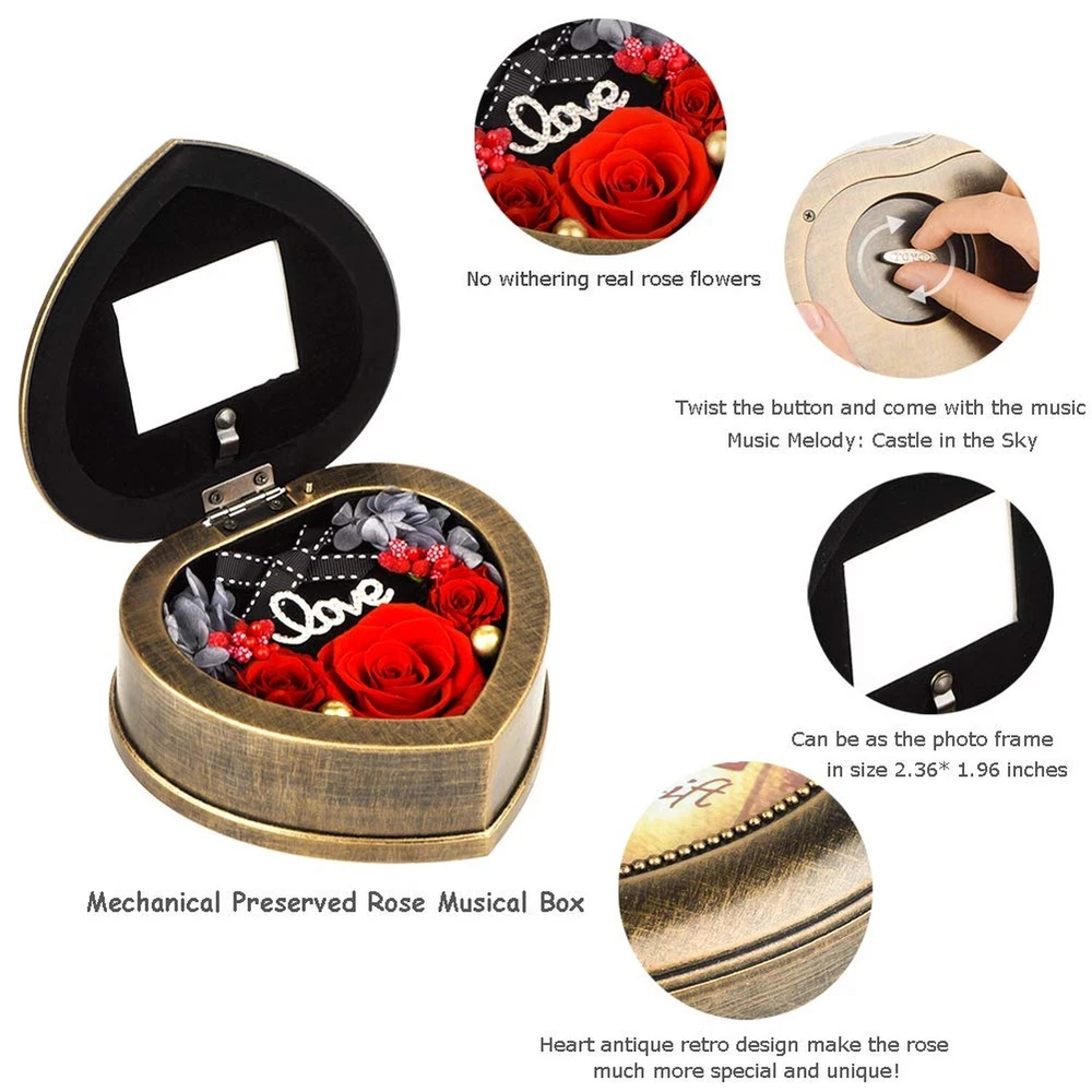 Handmade Preserved Flowers 3 Real Red Rose in Musical Box with Photo Frame, Long Lasting Fresh Flower Gifts for Wife Her Girlfriend on Valentine's Day Mothers Day Anniversary Christmas (Red) Product Details Color: Music +Red Rose Brand: Neaticoo MPN: MS-RED-001 UPC: 791258082558 EAN: 0791258082558 Brand: Neaticoo Plant or Animal Product Type: Rose Color: Music +Red Rose Material: Plastic, preserved flower Product Dimensions: 5.51"D x 5.51"W x 2.56"H Brand: Neaticoo Plant or Animal Product Type: Rose Color: Music +Red Rose Material: Plastic, preserved flower Product Dimensions: 5.51"D x 5.51"W x 2.56"H Recommended Uses For Product: home decoration, Gift, keepsake, Craftsmanship, present Specific Uses For Product: anniversary gift for her, christmas gifts, birthday gifts present for wife, Valentines day gifts her, Mother's Day flower gifts Indoor/Outdoor Usage: Indoor Package Information: Gift Box Occasion: Mother's Day, Christmas, Anniversary, Birthday, Valentine's Day Number of Items: 3 Item Weight: 0.34 Kilograms Container Material: Plastic Special Feature: 4. As flower is the natural growth, the size of each flower will be some different. Each one is unique., 1. Preserved fresh flower is for indoor decoration, please don't put it outside or in the sunshine. And no need any watering ., 3. It's with photo frame design, you can DIY your photo on it, which makes the music box gift more memorable and meaningful., 2. Long lasting and keep long time fresh flowers make it special. Music makes it perfect. Base Diameter: 5.51 Inches Container Shape: Heart shape Included Components: 1 music box included, Includes 3 red preserved rose flowers, 1 Gift box included Item Package Quantity: 1 Warranty Type: Lifetime Shape: Heart shaped Unit Count: 1 Count Scent: Unscented Seasons: All, Winter, Autumn, Summer, Spring Package Type: Existing Frustration Free Manufacturer: NIDLIFE UPC: 791258082558 Item Weight: 12 ounces Country of Origin: China Item model number: MS-RED-001 Is Discontinued By Manufacturer: No Volume: 77 Cubic Inches Fabric Type: Mechanical Music Box Base, Preserved Rose Flowers Maximum recommended load: 0.95 Pounds Finish types: Antique retro design Assembly required: No Number of pieces: 1 Warranty Description: We provide you 30 days refund and 360 days warranty policies, if you need any help from us , kindly contact us freely, we will help you to solve any problems you meet . Batteries required: No Mechanical Music Box Base Real Rose Flower MadeForever Rose is made of 100% real fresh rose preserved by high technique and unique preservation method. It retains the color, shape and feel of natural rose but can keep fresh much longer. The eternal rose flowers can be lasting 3 to 5 years without withering if it's saved properly. Even pollen allergy crowd can also normally enjoy the flowers.It means that can keep your love fresh and eternal. Your love deserve the best. Unique antique music box with photo frame design Musical box is mechanical and manual,no need any battery to drive. It's a beautiful luxurious present by the antique retro design, also it could be used as photo frame, you can DIY your precious photo on it. And the music tune is "Castle in the Sky" with Rhythm 18 notes. Size and gifted packingThere are 3pcs never withered preserved roses(1pc*1.8 inches & 2pcs*1.18 inches) growing in the musical box. The size of music box is 5.51(W) *5.51(L)*2.56(H)inches. And there is a picture frame window with size 2.36 (L)* 1.96 (W) inches. Outer gift box size is 6.3(W) *6.3(L)*3.35(H) inches. Valentines day gift for her womenPreserved flower is a symbol of eternal true love, appreciation and caring. Music easily creates the romantic atmosphere. It's perfect gift idea for your girlfriend,wife,mom, grandma and your beloved ones as Valentines day gifts, Mother's day gifts, Christmas gifts, Thanksgiving gifts, anniversary gifts for her, anniversary present for wife, birthday gifts for girlfriend or holiday party present for women. Strict quality checking and Vary ColorsThere are red, purple, blue, pink, rainbow for this preserved rose. Get the favorite color to be as gift or home, bedroom and office decoration. Each of our forever rose is thoroughly and rigorously tested, so you can rest assured to buy. ORDER NOW to get this special gift for her!