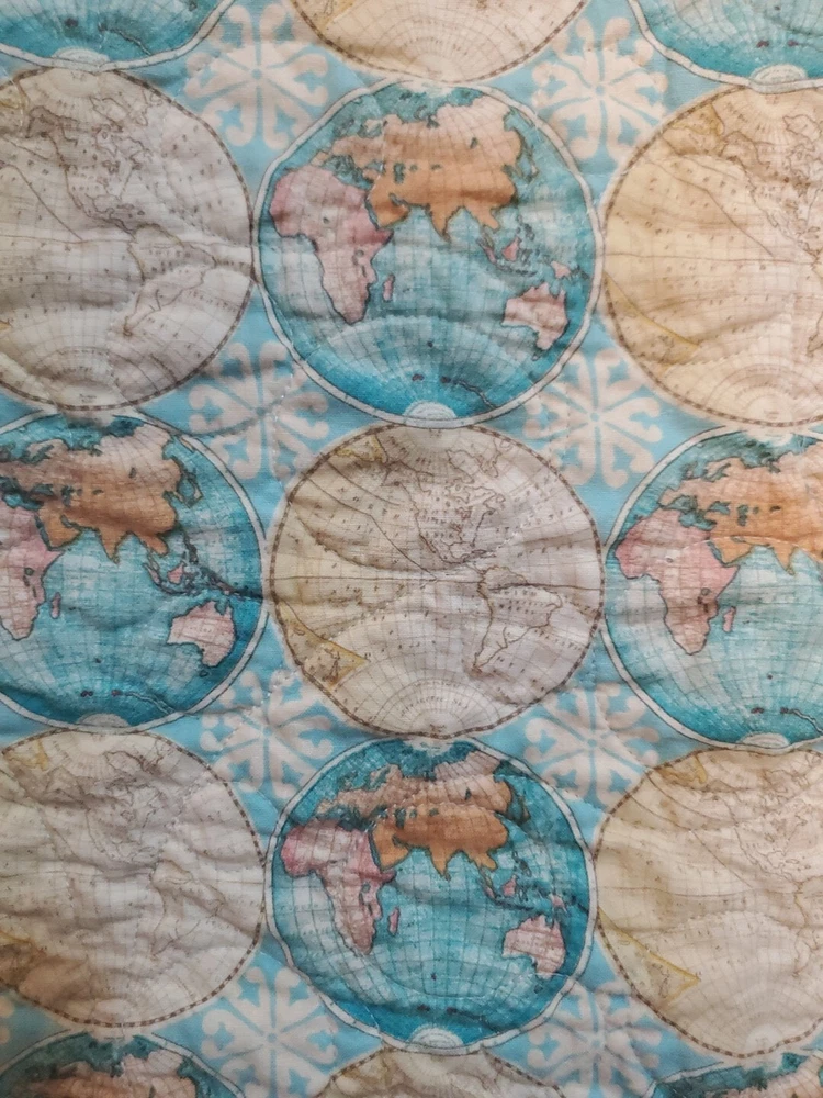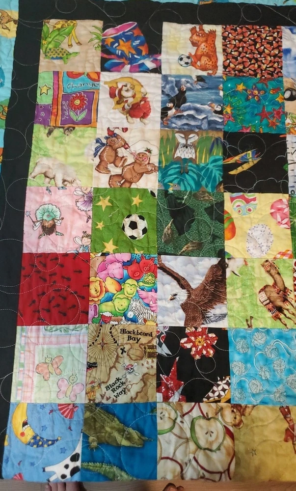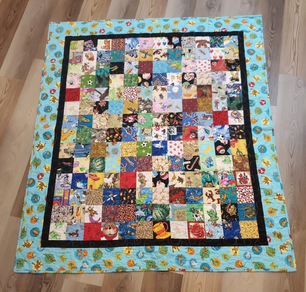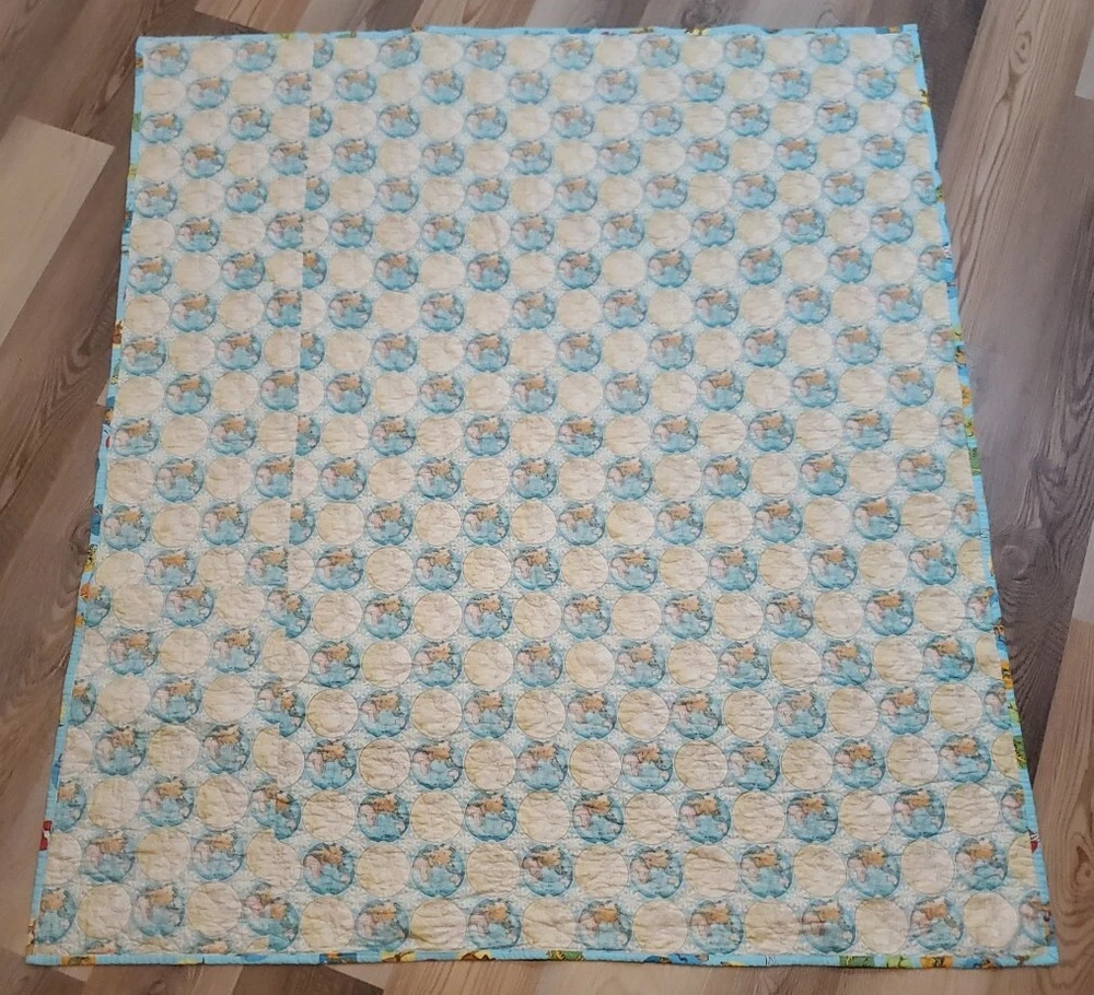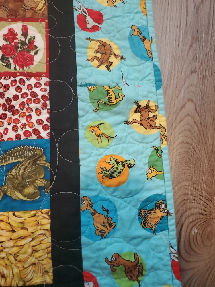 Beautiful colors with Dr. Suess theme on borders and world map on back. Throw blanket or wall hanging. Too many other themes on squares to list. See pictures. This is a super fun quilt to look at. Excellent Pre Owned Condition. 00s6v9r9sd2%