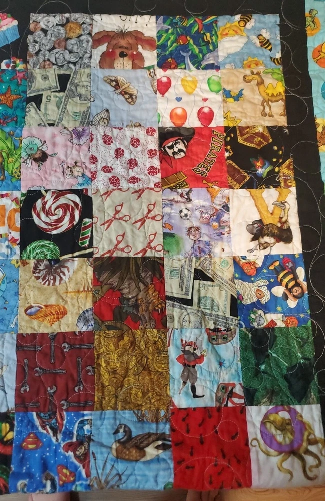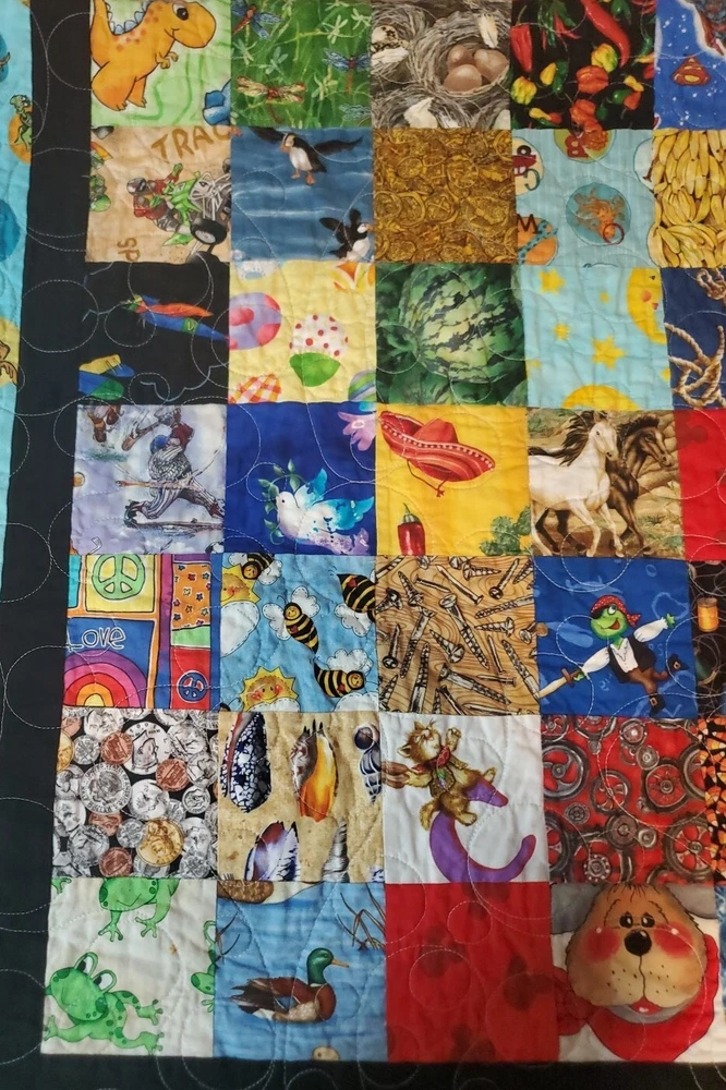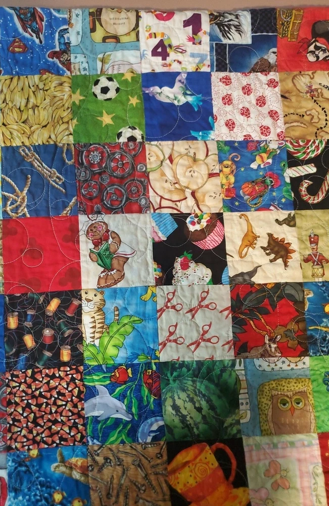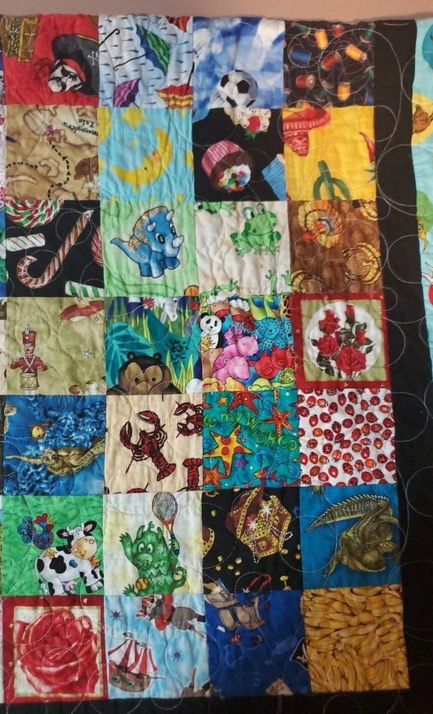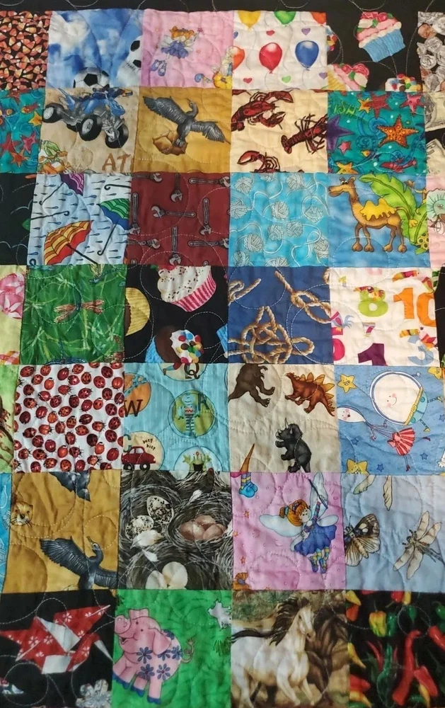 Beautiful colors with Dr. Suess theme on borders and world map on back. Throw blanket or wall hanging. Too many other themes on squares to list. See pictures. This is a super fun quilt to look at. Excellent Pre Owned Condition. 00s6v9r9sd2%