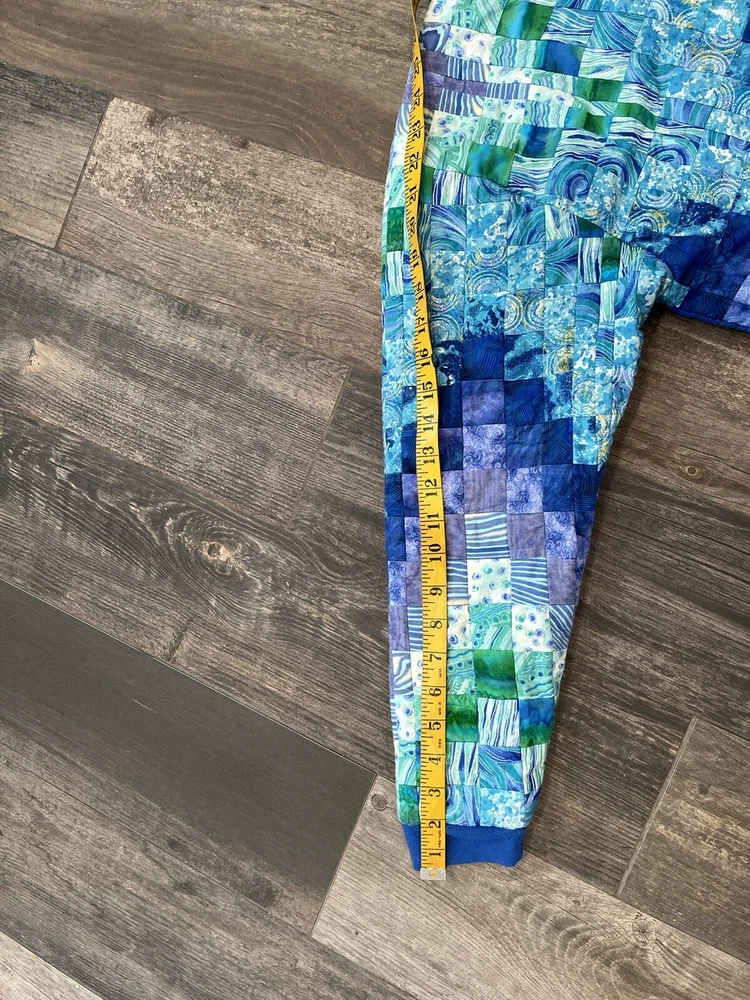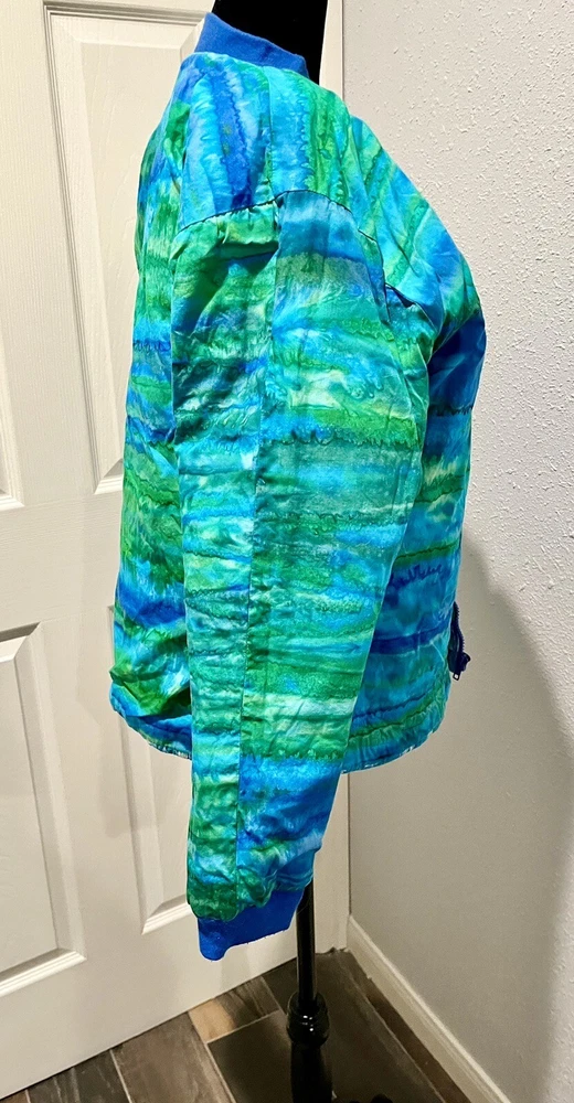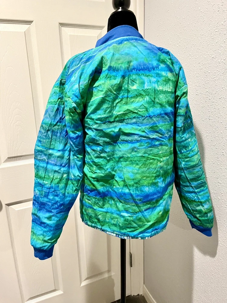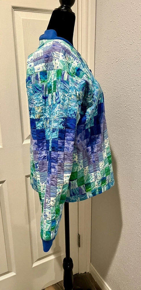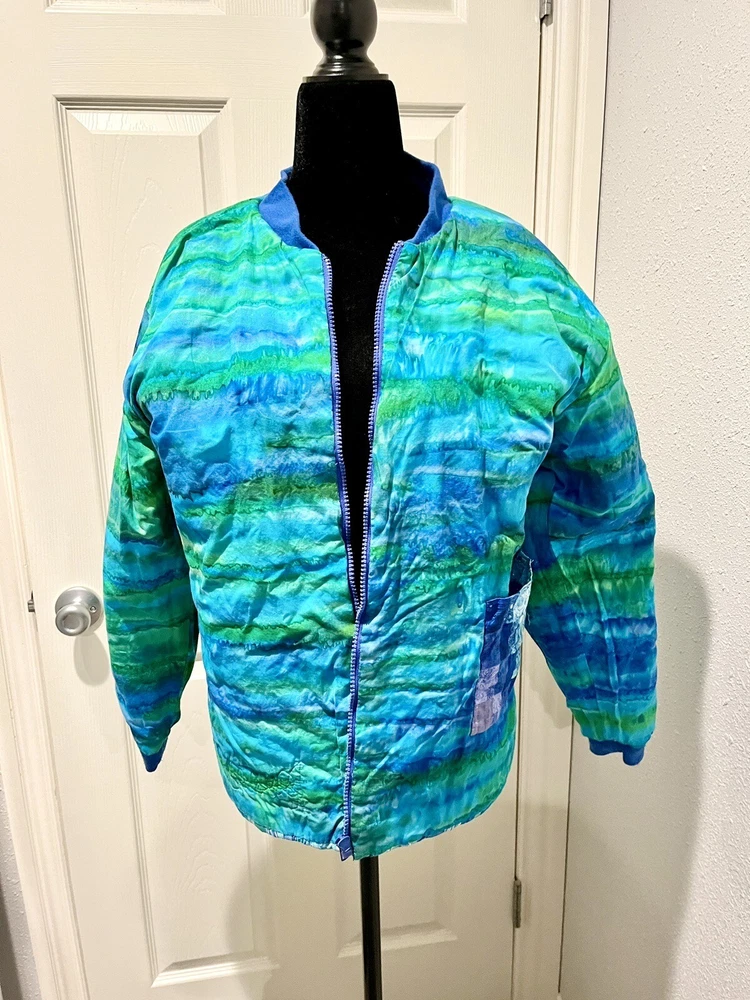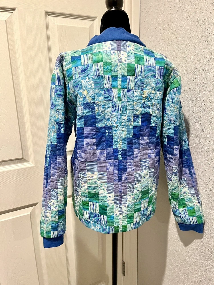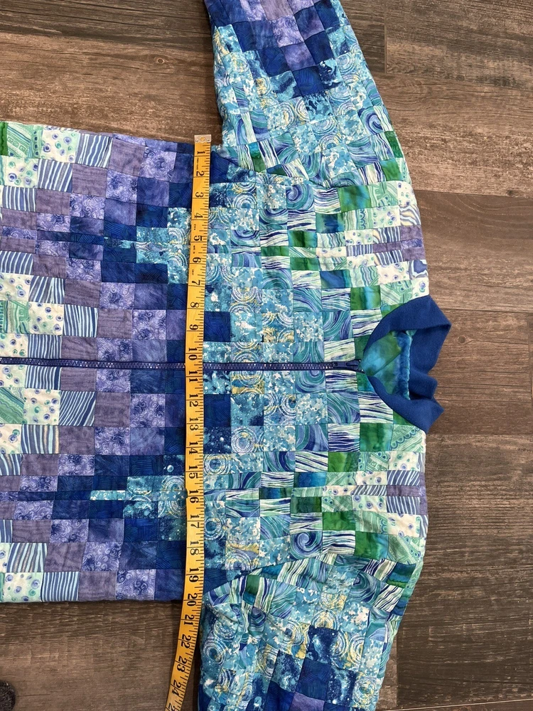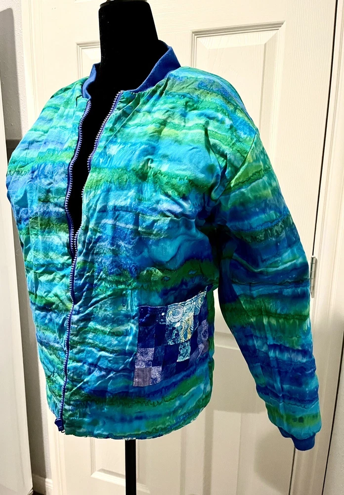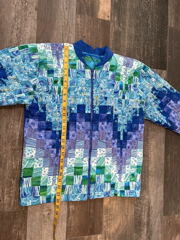 Handmade Quilt Coat Vintage Quilted Jacket Chore Barn Coat Patchwork Reversible Handmade Quilt Coat Vintage Quilted Jacket Quilted Chore Barn Coat Patchwork This jacket is handmade from a vintage quilt, long sleeves with elastic cuffs, full zipper front, elastic bottom. Pockets. Beautiful blue and green colors. And watercolor pattern when reversed. Reversible but when reversed it’s not zippable. Approximate measurements makes it like a women’s M/L- measurements in the photos. Beautifully handmade and makes a statement. This is a lovely 1 of a kind piece. This is the actual item you will be receiving. Try the ZOOM feature to take a closer look. Thank you for viewing my listing. I recognize that I am your "eyes" on all listings, and attempt to show the item from every angle and photograph any area of concern. Most items are mine and I would not sell anything that I wouldn't use myself. All items are sold as is -- so please look at all photos as the description. Please take time to view my other items and add me to your favorite seller list. We are a SMOKE FREE HOME.