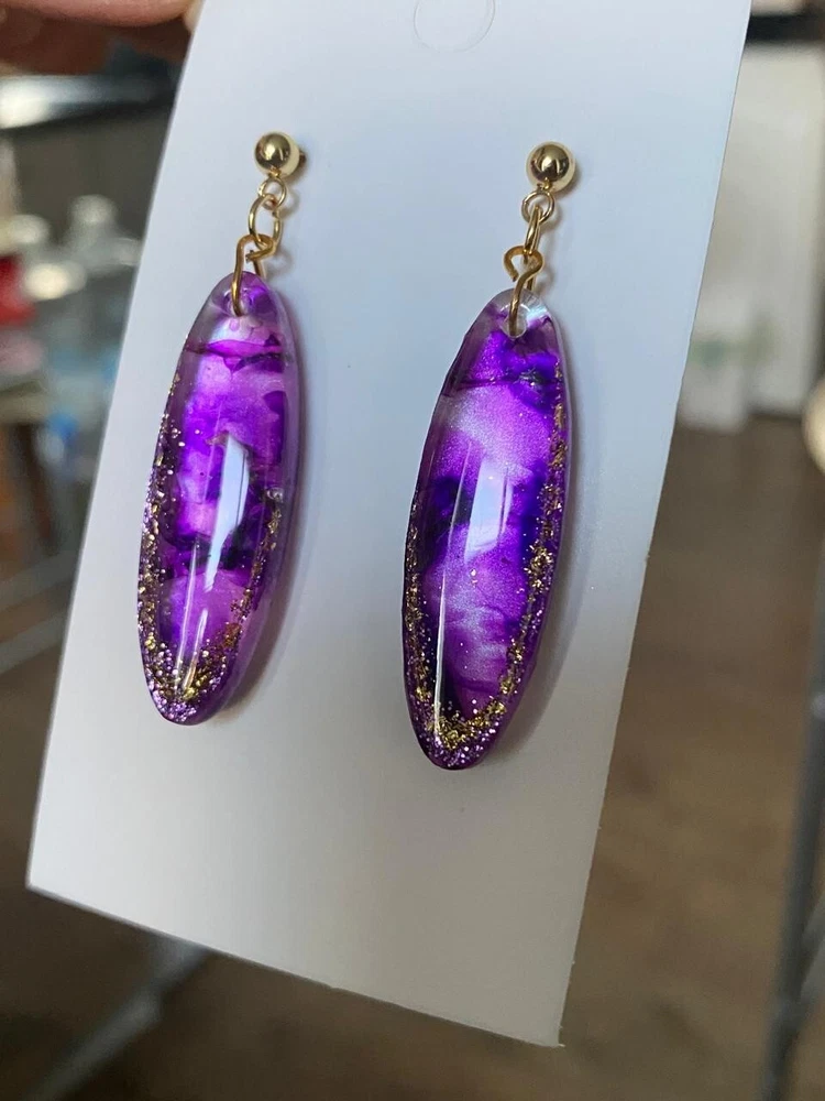 Add a touch of unique elegance to your ensemble with these handcrafted resin earrings, boasting an oval shape that complements their tassel style. The vibrant purple hue is accentuated by the warm glow of yellow gold plating, creating a striking contrast that's sure to turn heads. Designed for the lobe, these unbranded earrings are a testament to bespoke fashion, marrying craftsmanship with contemporary design. Each pair is unique, confirming your style as individual as you are. Whether it's for a special occasion or to add a sparkle to your everyday wear, these earrings are a subtle yet sophisticated choice.