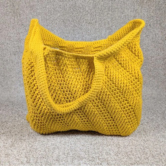 Looking for a way to cut down on plastic bag use? Grab one of my grocery totes and carry more in every bag! My grocery totes are strong and flexible. I can fit 2 gallons of milk in one of my totes and carry it up a flight of stairs - no problem! No more bags breaking because it snags on the edge of a box. No more paper bags falling apart when it gets wet. And the best part? My bags are machine washable and dryer safe. I use these bags every week and it amazes the grocery store clerks how much can fit in 1 bag. The bags are my own design and made from yarn used to standing up to abuse. Hand Crocheted in a Smoke Free/Cat Friendly Home - Cats are not allowed to play with yarn. Keywords: knit tote bag, mustard yellow bag, chevron pattern, handmade bag, cotton tote, knitted handbag, yellow tote, summer bag, beach tote, shopping bag, handcrafted bag, textile bag