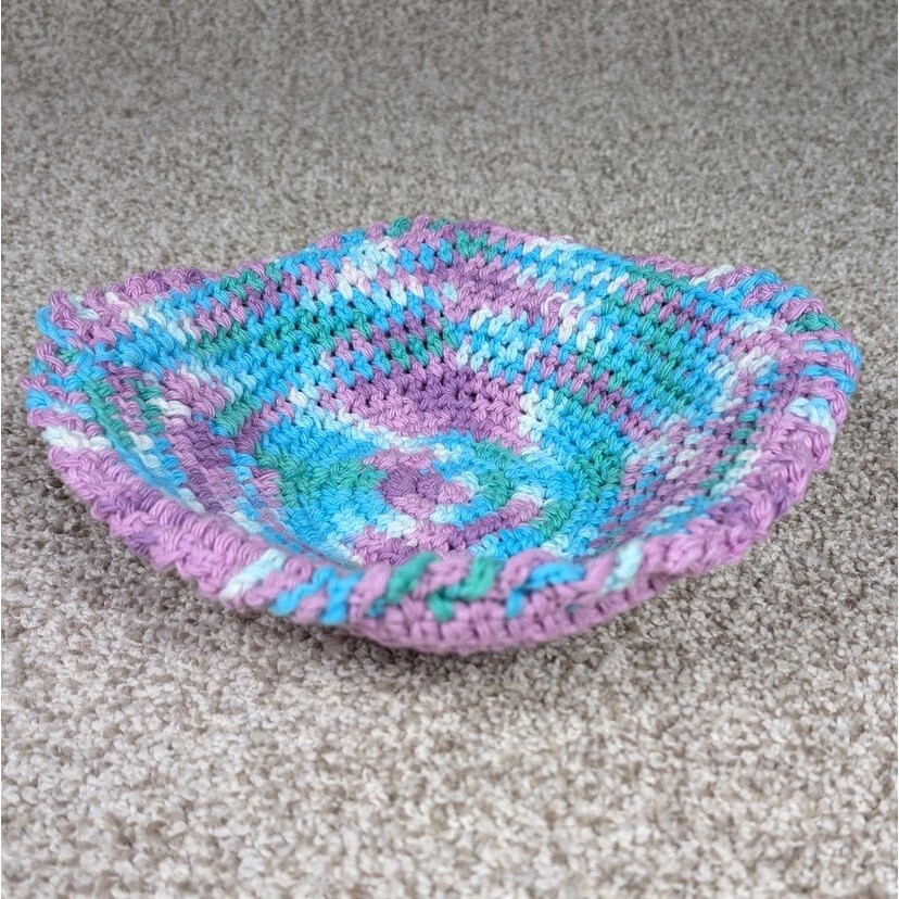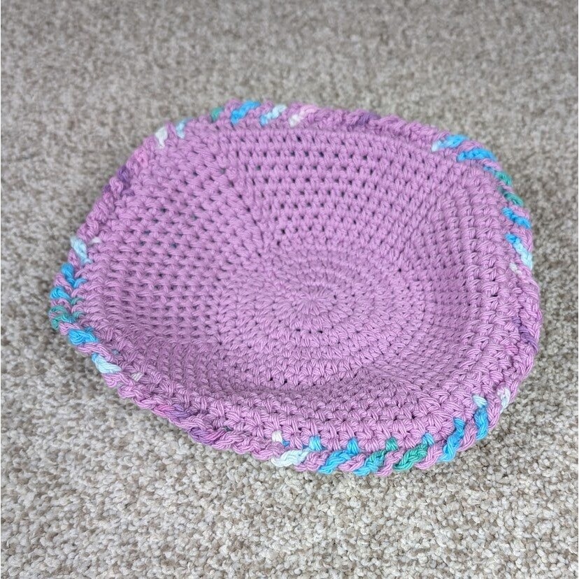 Bowl Hot Pad - Orchid/Beach Ball 2 layer crocheted bowl cozy 100% Cotton 10" wide at top x 4" tall, 4" diameter on bottom Works great as a pot holder for hot bowls straight from the microwave From Smoke Free/Cat Friendly Home - Cats are not allowed to play with yarn Keywords: crochet bowl cozy, handmade bowl cozy, reversible bowl cozy, hot pad, bowl holder, purple bowl cozy, blue bowl cozy, unique kitchen decor, handmade kitchen, gift idea, housewarming gift, table decor, kitchen accessory, bowl mat