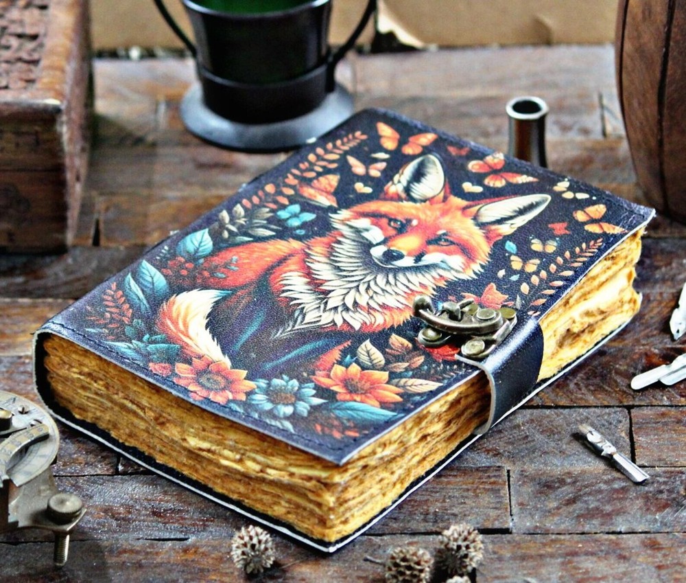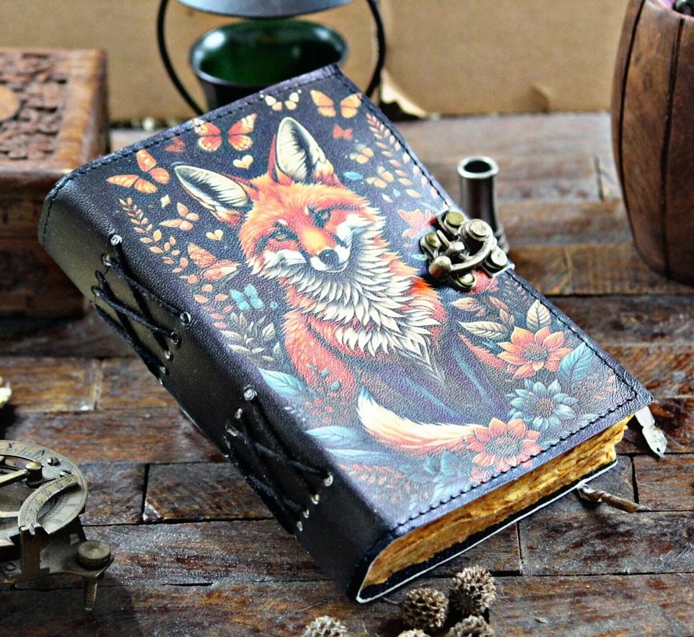 This Handcrafted Leather Fox Journal is a luxurious and limited edition notebook perfect for writing and sketching. The rustic leather cover adds a touch of elegance, while the personalized touch makes it a unique gift for any occasion. Made in India, this journal is a special addition to any desk or collection, ideal for those who appreciate handmade craftsmanship and attention to detail. Perfect for business, industrial, or personal use, this journal is a timeless piece that will inspire creativity and organization for years to come. Vintage lock closure • Genuine buffalo leather • Vintage deckle edge old paper • handmade rustic cotton paper • 100 Sheet (200 pages both side) Elevate your creative journey with our meticulously handcrafted Fox Leather Journal. Crafted with care and adorned with a stunning fox design, this rustic notebook is your perfect canvas for writing, sketching, or documenting your adventures. Each journal is a unique work of art, lovingly made from premium leather. Its acid-free pages provide an inviting surface for your thoughts, stories, and artwork. Whether you're an artist, writer, or nature enthusiast, this journal complements your creativity. The fox, a symbol of cleverness and adaptability, adorns the cover, inspiring you on your artistic endeavors. Embrace the charm of this Fox Leather Journal and let your creativity roam free. - Leather journal witchcraft book of shadows notebook is made with 200 pages of Antique Paper which looks like it was pulled from history. You will fall in love with the the antique handmade cotton paper which is unique to our Vintage Journal Notebook. ● The vintage clasp lock will keep all your valuable writing locked inside.Sturdy hand stitched binding to make sure that no paper comes out loose from your spell notebook. ● The witchcraft supplies journal is printed with a special seven stone called “Chakra healing” which helps to reveal inner truth within yourself and encourage self-awareness and self expression. We have taken extra to make sure that the emboss is perfect in every piece. ● Sketch, Doodle, Write on your Leather Blank Spell Journal with a Calligraphy Pen Fountain Pen, Brush Pen, Ball Pen, Acrylic Colours, Watercolor and many more. We guarantee no bleed through. ● Can be used as a notepad, journal, writing notebook, sketch book. 1.25 inch thickness, easy for handwriting, drawing or sketching and compact for carrying in your bag. Ideal for alternative ● Artist Sketchbooks, Photo Album, Traveling Notes, Business Executive, Logbook, Poetry Work, Journalists, Food Planner, Instagram Scrapbook and Bible Journaling. ● Best Gift For Your Companion: A Journal Is Like A Trusted Friend. You Can Use It To Solve Queries, Get Inventive, Or Record Valuable Memories For Them To Last Forever Or You Can Just Use It As A Gift For Your Wife, Son, Or A Daughter Or For Some Enthusiastic Writer In Your Family. Even For Looking For A Miraculous Spell Book Or A D&D Gamer Looking For His Quest Book. ● Perfectly Sized For Multi-Purpose Use: Length 5", Width 1", Height 7" Inches, This Easy To Carry Personal Diary Is Perfect To Use As A Health Journal, Sketchbook, And Poetry Journal. It’S An Ideal Journal Which Records Your Daily Thoughts And Life Lists. And Also Good For Designing, Doodling, Or Calligraphy Of Your Choice. Handcrafted Leather Fox Journal Rustic Notebook for Writing & Sketching Gift for him her, Blank spell Book of Shadows, Handcrafted best gift ignore. Grimoire journal leather notebook book shadow leather sketchbook leather journal junk journal witchcraft journal spell book book of shadows sketch book leather bound journal black journal fox journal