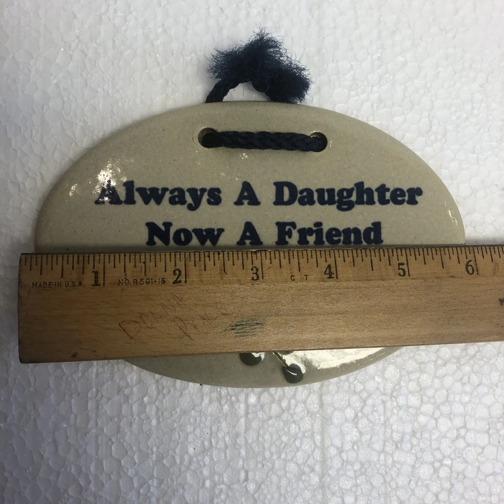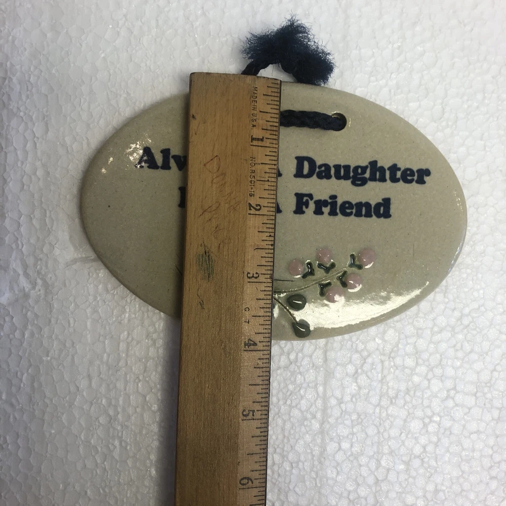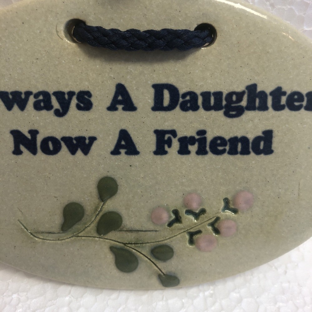 Brand:Mountaine Meadows PotteryCare Instructions:Clean with damp warm clothMaterial:Clay, StonewareRoom:AnySubject:DaughterCustom Bundle:NoStyle:Real LifeFeatures:Hand PaintedItem Width:6 inHandmade:YesType:PlaqueFinish:GlossyDepartment:Kids, Teens, AdultsTheme:Perfect In Any SettingPattern:InspirationalItem Height:4 inCountry/Region of Manufacture:United StatesVintage:YesAdditional Parts Required:NoColor:Off White Base with Blue WritingShape:Oval
