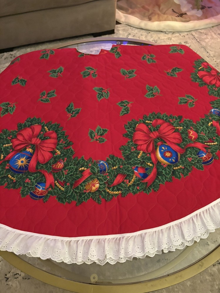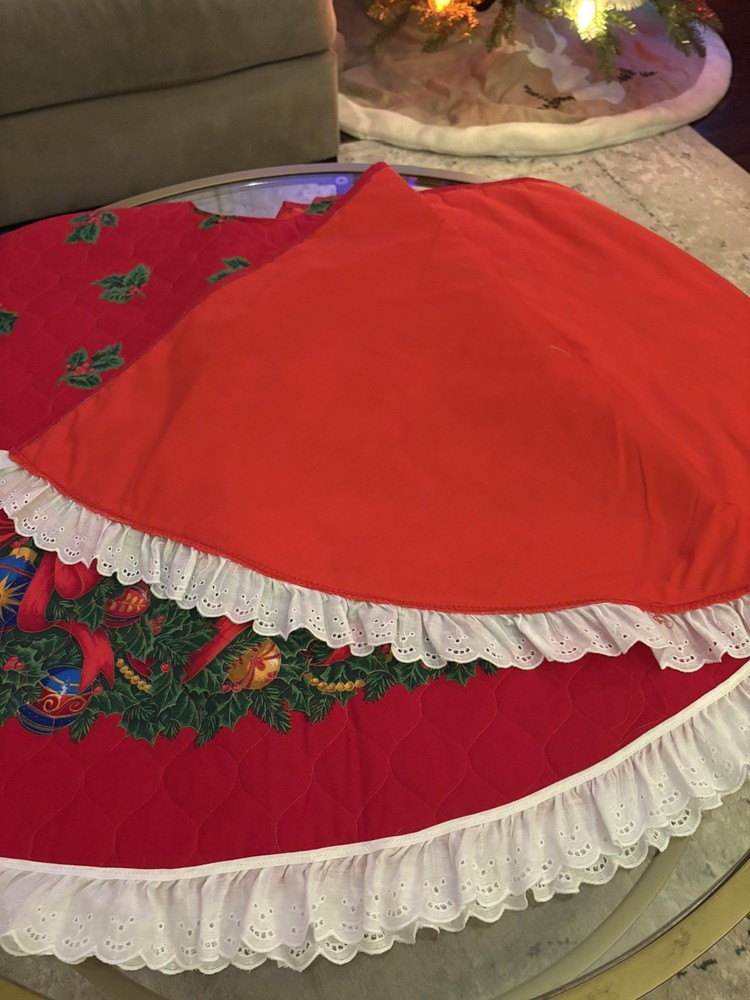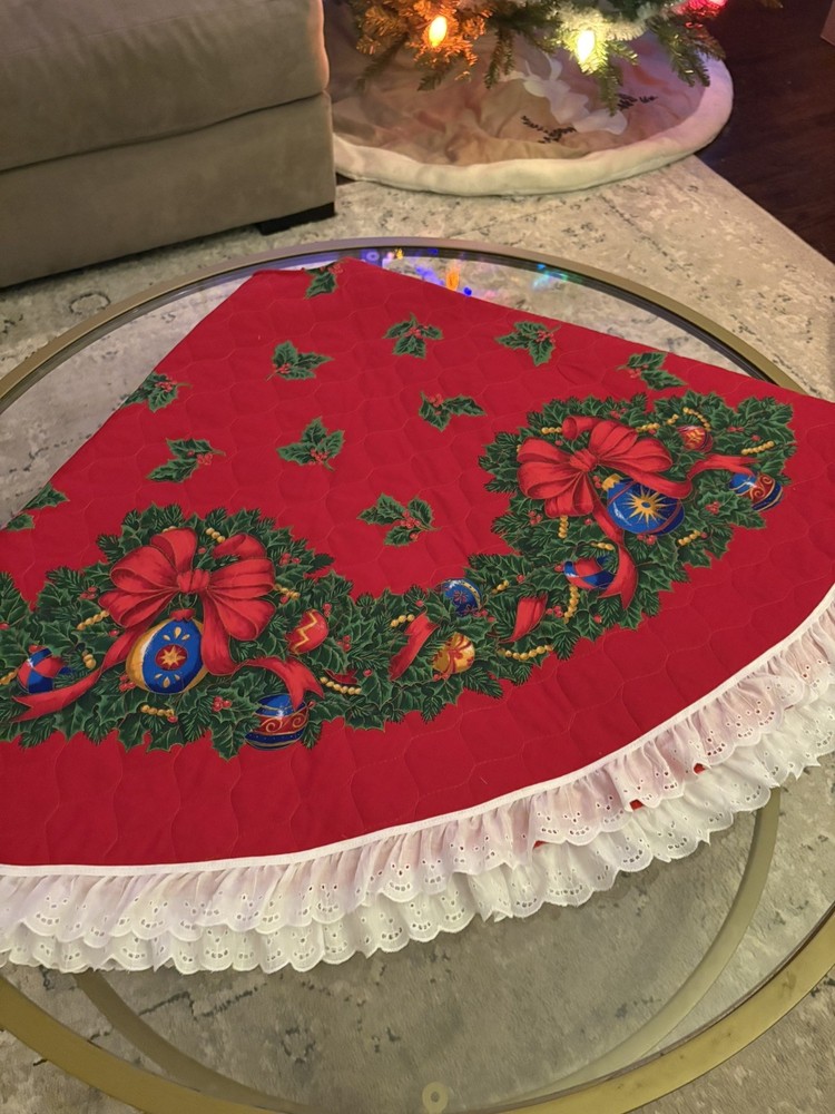 This product is a handmade vintage country Christmas tree skirt that measures 58 inches in size. It is designed in a classic red color and tailored for Christmas. Made with attention to detail, this one-of-a-kind tree skirt adds a festive touch to any holiday decor, bringing a traditional and rustic charm to your home during the festive season. Lined all around with lace detailing and solid red color on reverse side. Absolutely gorgeous!! Other prints and designs available, check out my other listings!
