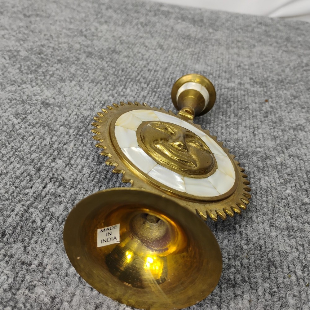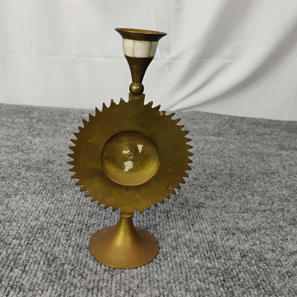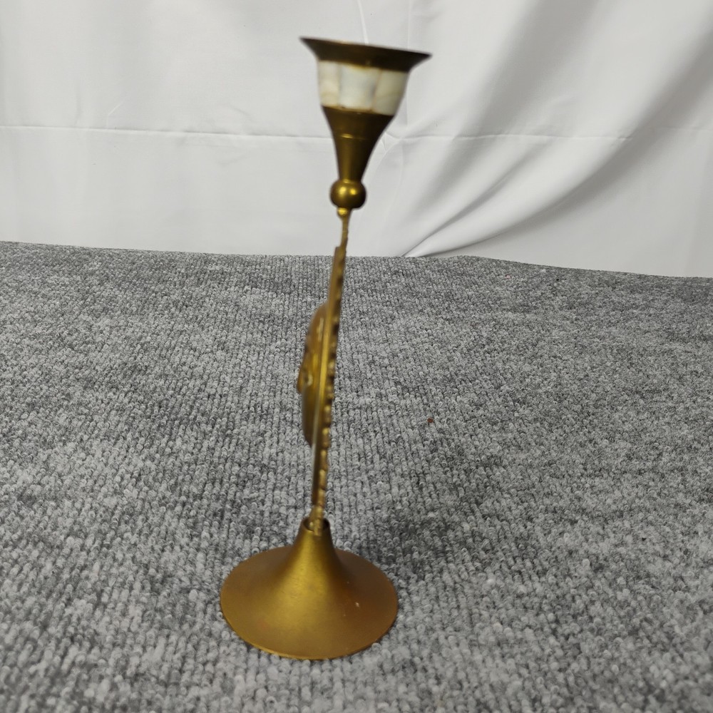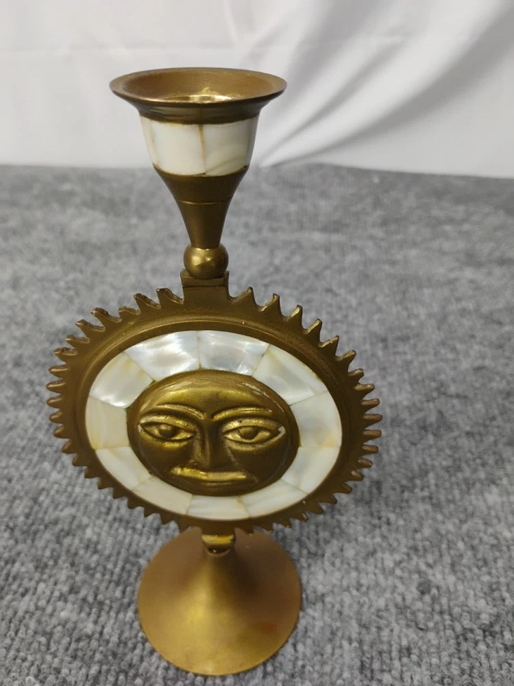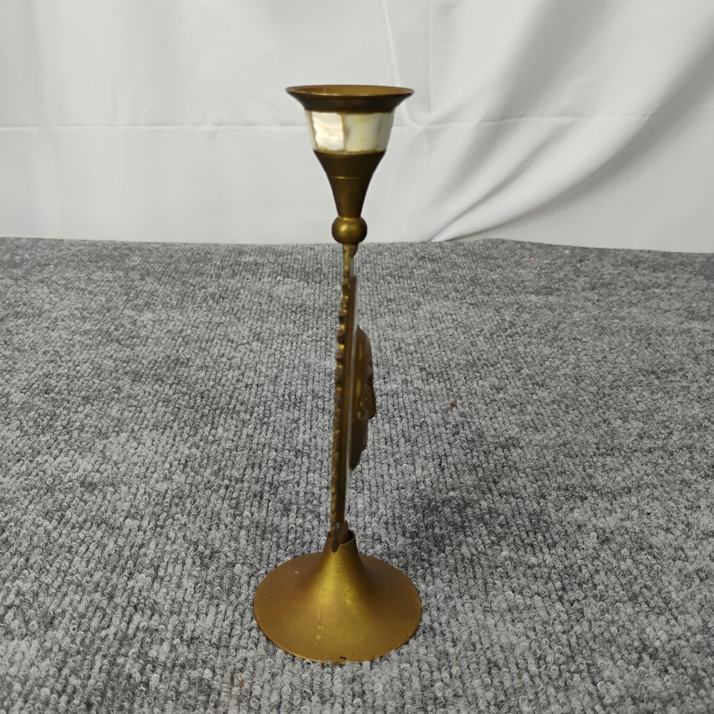 This product is a handmade vintage Mother of Pearl brass candlestick holder from the 1950s. It features an antique brass finish and a unique design. The combination of the intricate craftsmanship, the gold color, and the vintage appeal make this candle holder a standout decorative piece for any home.
