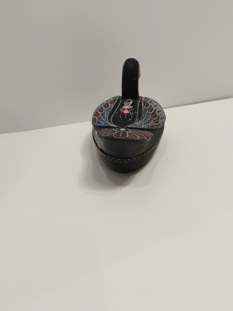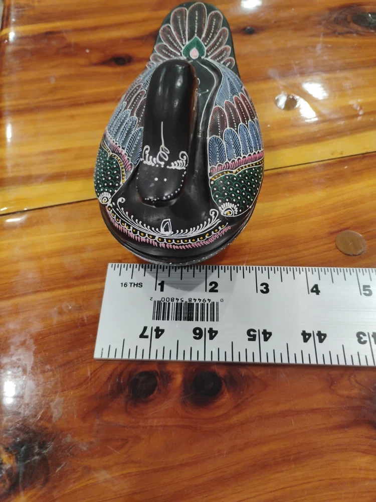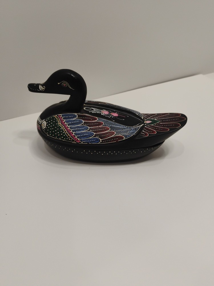 This product is a small handmade trinket box in the shape of a duck. It is made of wood with a matte finish and features a multicolor feather pattern. The box is 7 inches in length and opens to reveal a compartment for storing small items. It is suitable for all occasions and themes, including animals and wildlife. The duck is unboxed. It was made in Thailand.