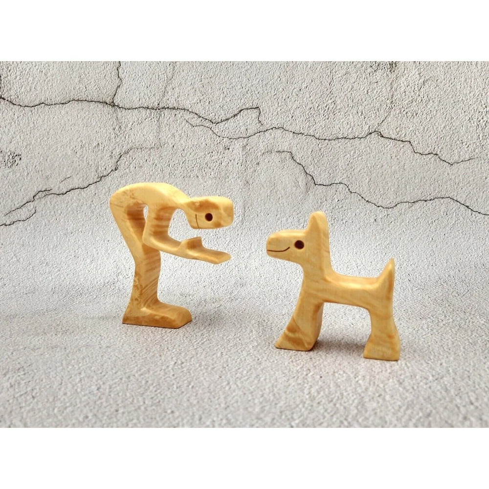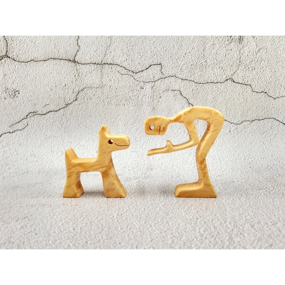 Handmade Wooden Terrier and Owner Figurine Unique Hand Carving Home Decor Look at this couple! I'm sure they bring their owners happiness and pure love! Great present for terrier and just dogs lovers, friends, mom and dad... It's just great present! The figure is made of maple burl wood, processed with special orange oil and wax. Ideally smooth surface, without hooking -looks like marble High - 3.5" (9 cm) Width - 4.7" (12 cm) This figurine will be the only one, because we never use the same kind of tree sample. And for sure nature never will make the same pieces like snowflakes. We only looking for perfect peace of wood for THAT ONE!