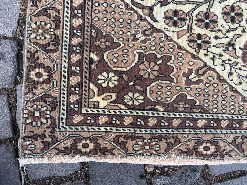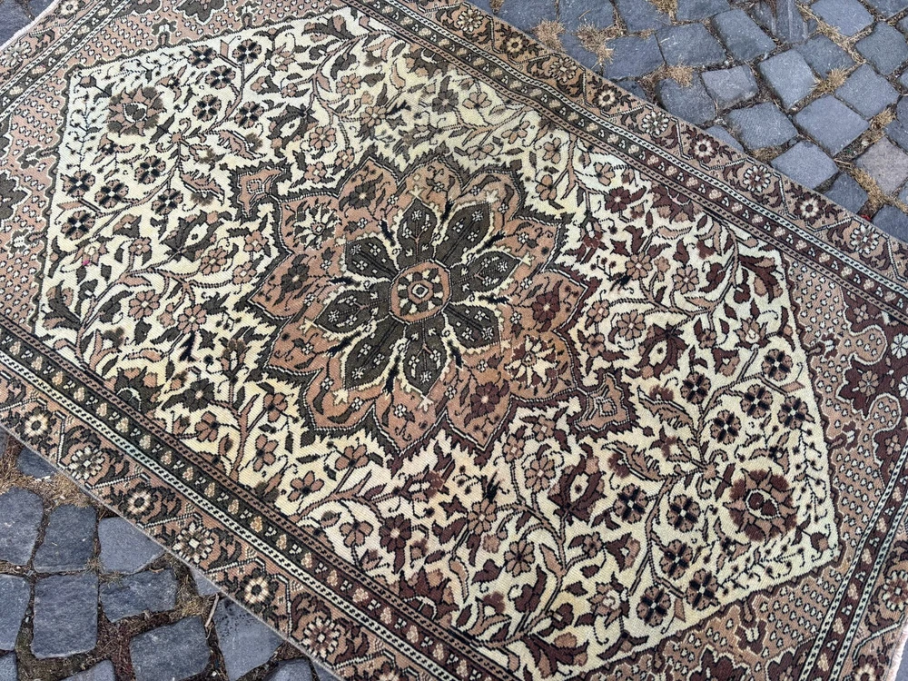Item Length: 67 in Era: Mid 20th Century (1941-1969) Country/Region of Manufacture: Turkey Production Technique: Knotted Style: Bohemian Original/Licensed Reproduction: Original Pile Height: 0.5 in Shape: Rectangle Brand: Handmade Features: Easy to Clean, Eco Friendly, Kid Friendly, Pet Friendly Regional Design: Turkish Color: Beige Culture: Turkey Weave: Hand-Knotted Item Thickness: approximately 0.2" (0.5 cm) Department: Boys, Girls, Teens, Adult Time Period Manufactured: 1960-1969 Pattern: Geometric Material: 100% Cotton, 100% Wool Room: Bedroom, Dining Room, Home Office/Study, Kitchen, Living Room, Nursery Item Width: 41 in Theme: 1960s & 1970s Size: 3 x 5 ft Type: Area Rug Handmade: Yes Pile Type: Normal