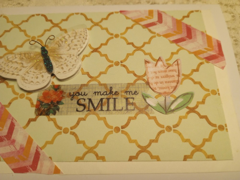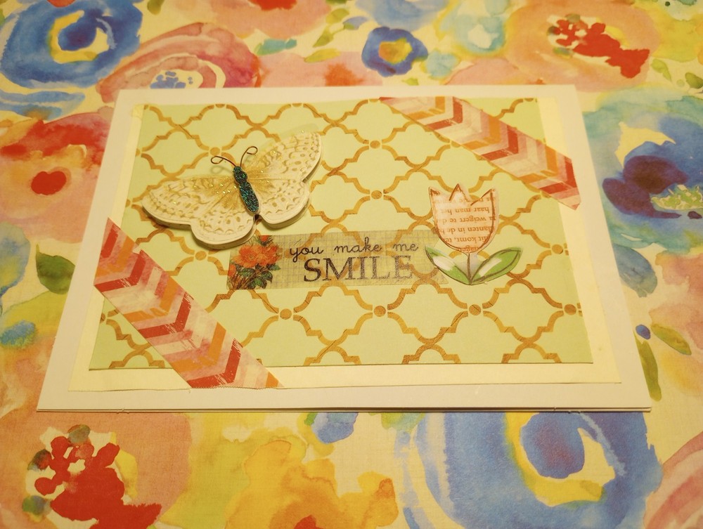 You make me smile, perfect card for cheering a friend up, or just to say hi. Used scrapbook paper, variety of stickers and deco tape. Measures 5.5 x 4 inches. Comes with envelope. Blank inside. Made by Cassie Lynn. Tags: You make me smile greeting card friendship greeting card any occasion greeting card spring break greeting card just saying hi encouraging scrapbooking paper stickers butterfly flowers glitter handmade homemade hand crafted artsy aesthetic scrappy style collage decor decorative mixed media washi tape mint green blue pink stationery note Card pen Pal Snail Mail gift For Her Birthday Graduation Anniversary Engagement Wedding Valentine's Day Present spring summer whimsigoth whimsygoth mixed Media Collage nature lover insect butterfly glam shabby Chic vintage aesthetic cottage core prairie girl garden God bless Jesus Christ prayer Bible study worship Church get well soon positive affirming encouragement encouraging You Make Me Smile - Any Occasion Greeting Card Just Saying Hi Hello Butterfly Whimsical Whimsy Mixed Media Collage Spring Summer Nature