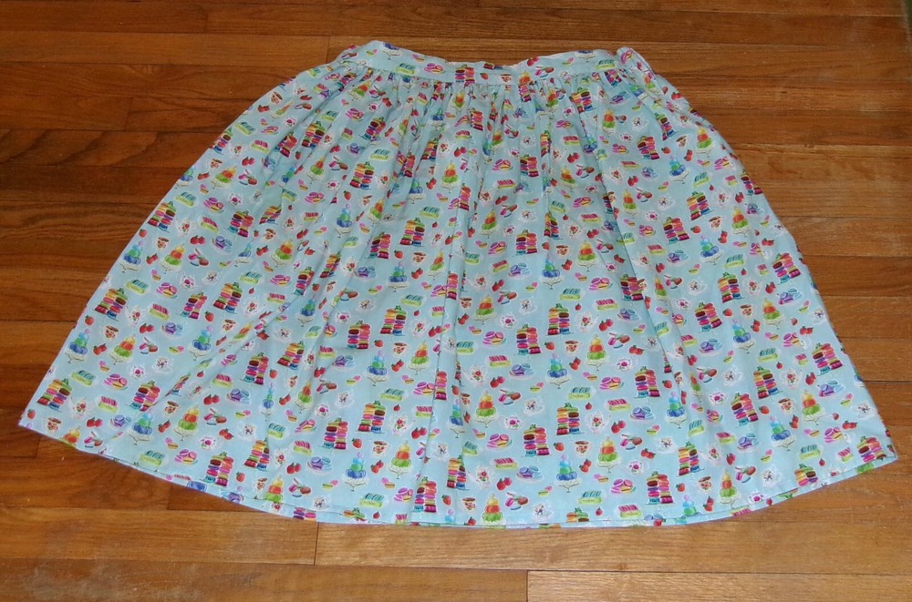 Custom-sewn gathered skirt on a aqua blue background. Very Modcloth style! Fits xl-1x: waist 35 flat, 38.5 stretched, 27 long, has a pocket. Flat front waist, side zipper and elastic back for extra room. Such a cute print with teapots, macarons, and delicious snacks. A beautiful nod to a vintage look in a modern woman's size! Buyers-questions are welcome! Items come from a smoke-free, pet-friendly home and are in good used condition unless noted; photos are illustrative, so please double-check size, style, and condition before bidding. Payment is due within 2 days-please place bids only if you're fully committed to purchasing. Sales are typically final, but if any issues arise, feel free to reach out—I’ll do my best to make it right.