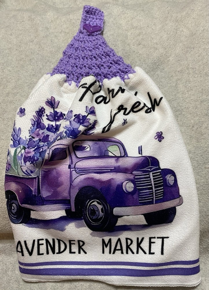 These handmade hanging kitchen towels are perfect for adding a touch of spring to your kitchen decor. Made from terry cloth with a crochet top in a "Farm Fresh Lavender Market" lavender color, these towels are not only stylish but also practical. Machine washable for easy care, these traditional-style towels feature a floral pattern and a lavender heart button detail, making them a charming addition to your kitchen. Made in the United States, this set includes one tea towel with a crocheted top, measuring 18" in length and 16-20" in width.