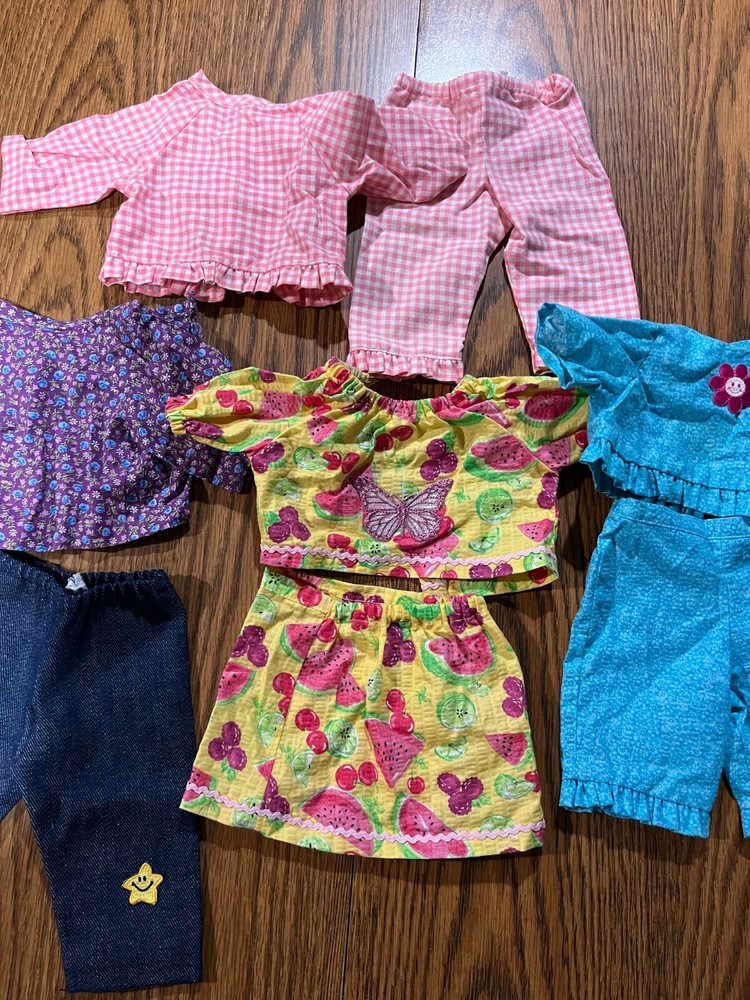 Handmade outfits for American Girl Dolls (4 Outfits) Please note these will need new iron on Velcro on the back for the shirts to close