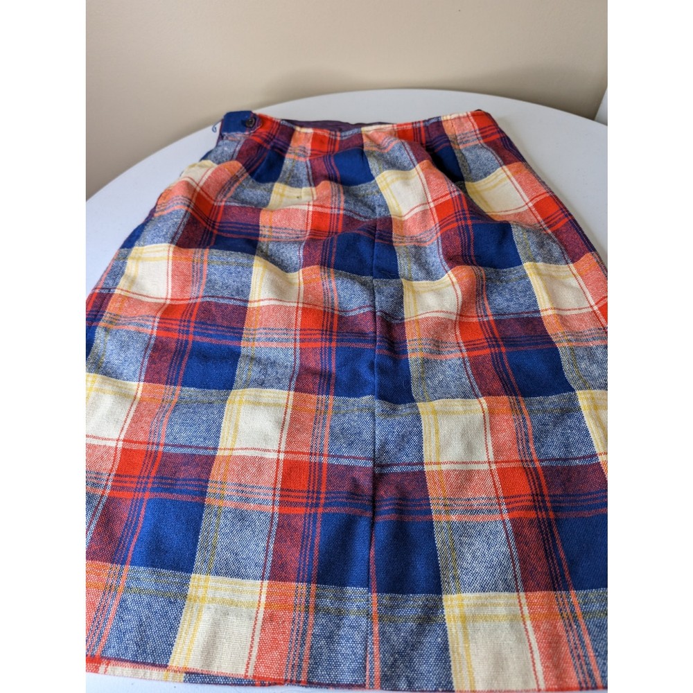 Hand made plaid skirt. Waist measures 14 inches laid flat, length measures 23 inches at longest point.
