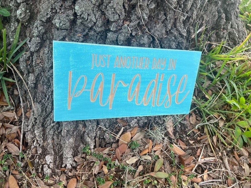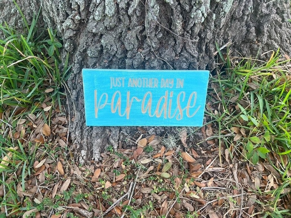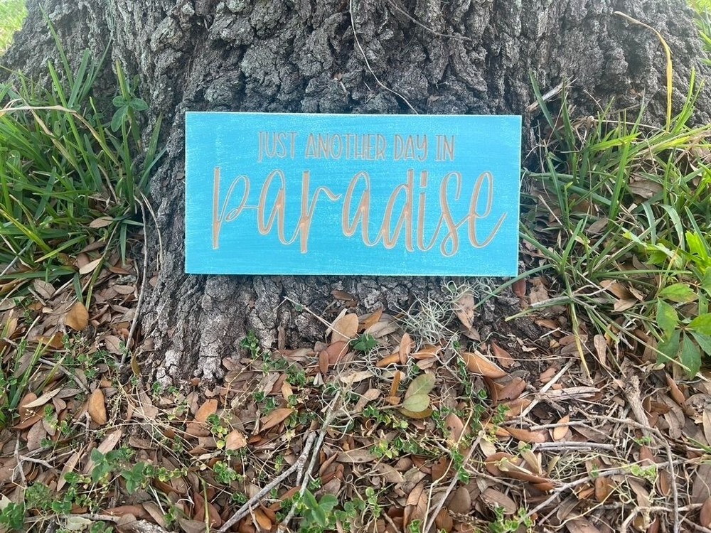 “Just another day in paradise” wood decor sign. Handmade wall decor with a CNC machine. Distressed blue paint. Engraved lettering for a 3D look. Sign is 12 inches wide and 6 inches tall. 2 Keyhole hooks are located on the backside for hanging. Multiple top coats for added protection.