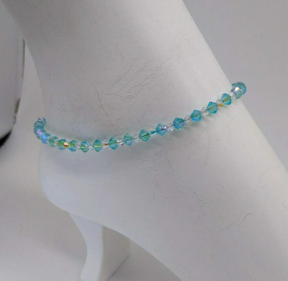 This handmade, durable anklet/ bracelet consists of 4mm Swarovski Crystal Light Turquoise Shimmer 2X and clear bicone beads strung on stainless steel wire. The lobster claw clasp is made up of steel, pewter, and silver-plated pieces. **The "shimmer" effect is a new effect that is comparable to the classic Aurora Borealis AB effect. The shimmer effect is a lighter coating that is more transparent than AB so the original bead color shines through and radiates three shades of its color for even more "shimmering" light reflections Guideline for choosing length *Small Bracelet - 6" (child size) *Medium Bracelet - 7" *Large Bracelet - 8" (also a great anklet size for school age kids) Small Anklet - 9" Medium Anklet - 10" Large Anklet - 11" (I've had school age girls use this size to be a choker necklace) **Let me know if you are an in between size (ex 7 1/2") I will make it to your size :-) I love doing custom orders, so feel free to request your own combination of colors. I have over 100 different colors of Swarovski bicones. If at any time the anklet breaks for any reason or needs a sizing adjustment, send it back to me at any time and I will fix/alter it. All you pay is shipping. I take very much pride in making my jewelry sturdy and durable. **Combined Shipping w/ multiple items: $3.95 (USA Orders) ~~Shipping should automatically combine when adding items to your cart; if you get charged extra for shipping, please send me a message and I will refund you. ~~Canada - $18 Flat Rate Shipping ~~International Orders: I ship through the Ebay Global Shipping program **Special Requests ~~ Feel free to make special requests with your order; I'll do my best to accommodate. **Returns ~~I take pride in sending quality and durable items. If there is any problem/concern/question with your order, please contact me. I will do what I can to correct, compensate, or replace the item. **NOTE: USPS is experiencing delays, so even though I send the package out on time, actual delivery may be later than expected. This is out of my control and in the hands of the post office. My daughter is learning the importance working hard and saving her money. She is selling her handmade bracelets. Please consider adding one to your cart with your order. Thank you! Handmade Elastic Bracelets by Cassie; Age 7 | eBay