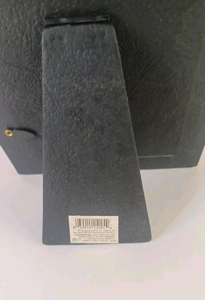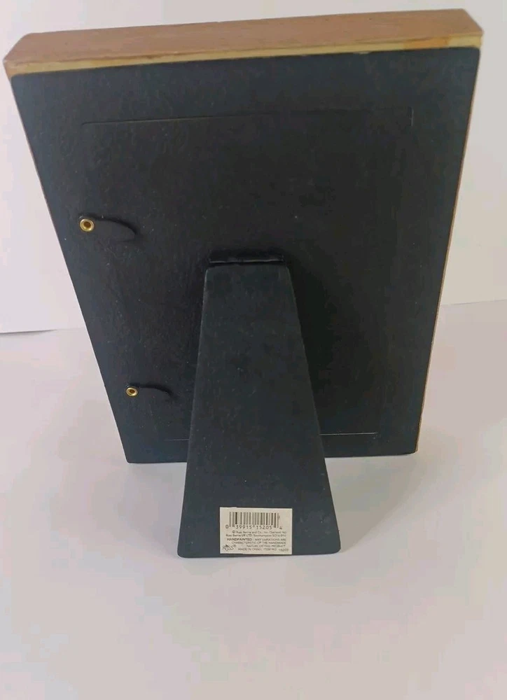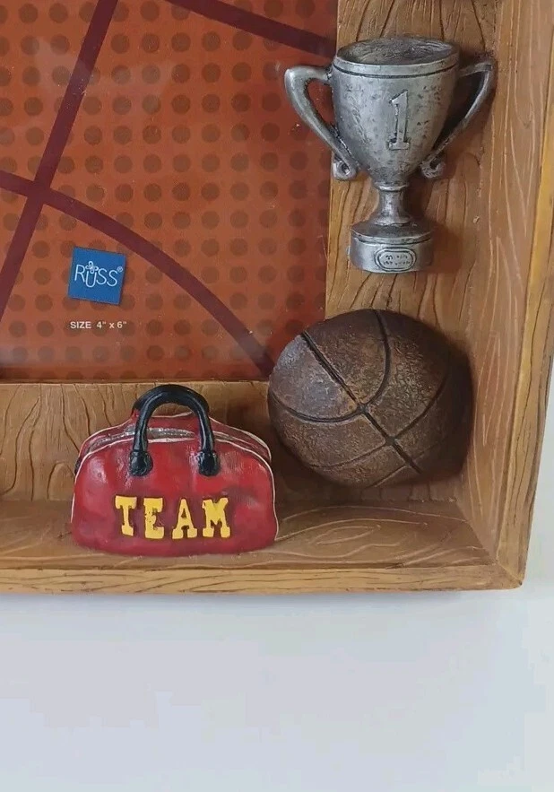This is a handpainted wood photo frame with a 3D basketball shadowbox design. It is suitable for a 4 x 6 inch photo and has a rear-loading type of photo insertion. The frame is rectangular in shape and has a matte finish. The product is made by Russ Berrie and has a sports theme. The frame is 8 inches in height, 7 inches in width, and 6 1/8 inches in length. It is suitable for displaying a single photo and has a box frame depth of 1 inch. There is some wear on the frame as shown in photos. Sold as is