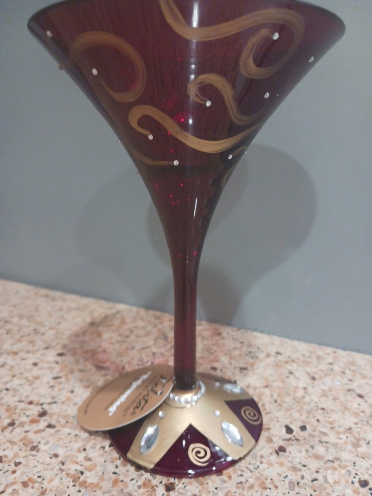 The Lolita hand painted Martini glass is a whimsical and festive addition to your holiday celebrations. This unique glassware piece features a vibrant red color and intricate hand-painted details, perfect for serving your favorite cocktails during the festive season. The bejeweled design adds an extra touch of sparkle, making it a standout piece for Christmas gatherings.