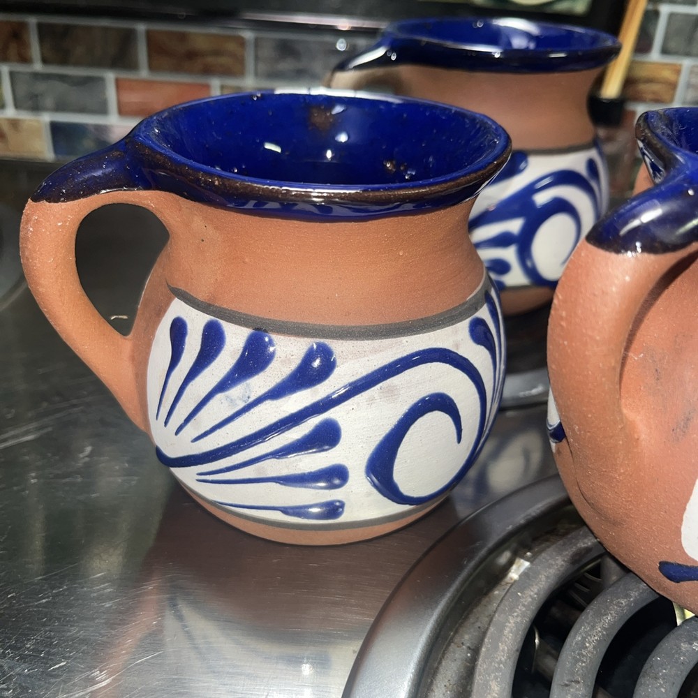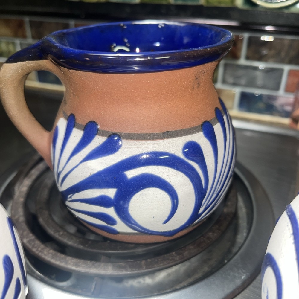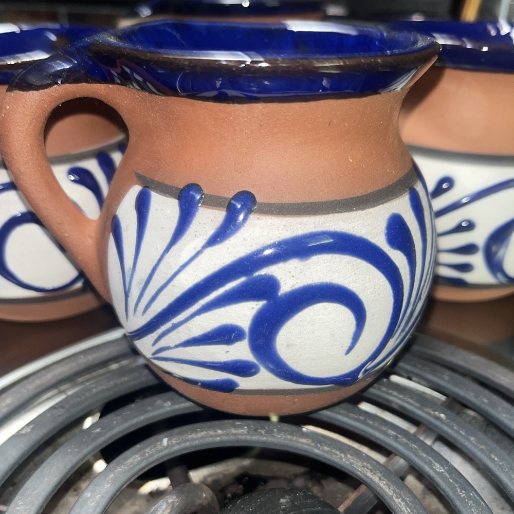 This Mexican Coffee Hot Chocolate Clay Mug Set includes four round mugs, each hand-painted with a swirl pattern in clay, blue, and white glaze. The vintage mugs have a 12oz capacity and are specifically made for hot beverages, such as coffee or hot chocolate. Manufactured in 2000 in Mexico, these unique mugs are a part of a set perfect for all occasions and feature traditional Mexican craftsmanship and style. The mugs are recommended to be hand washed and are ideal for those who appreciate authentic, hand-made pottery.