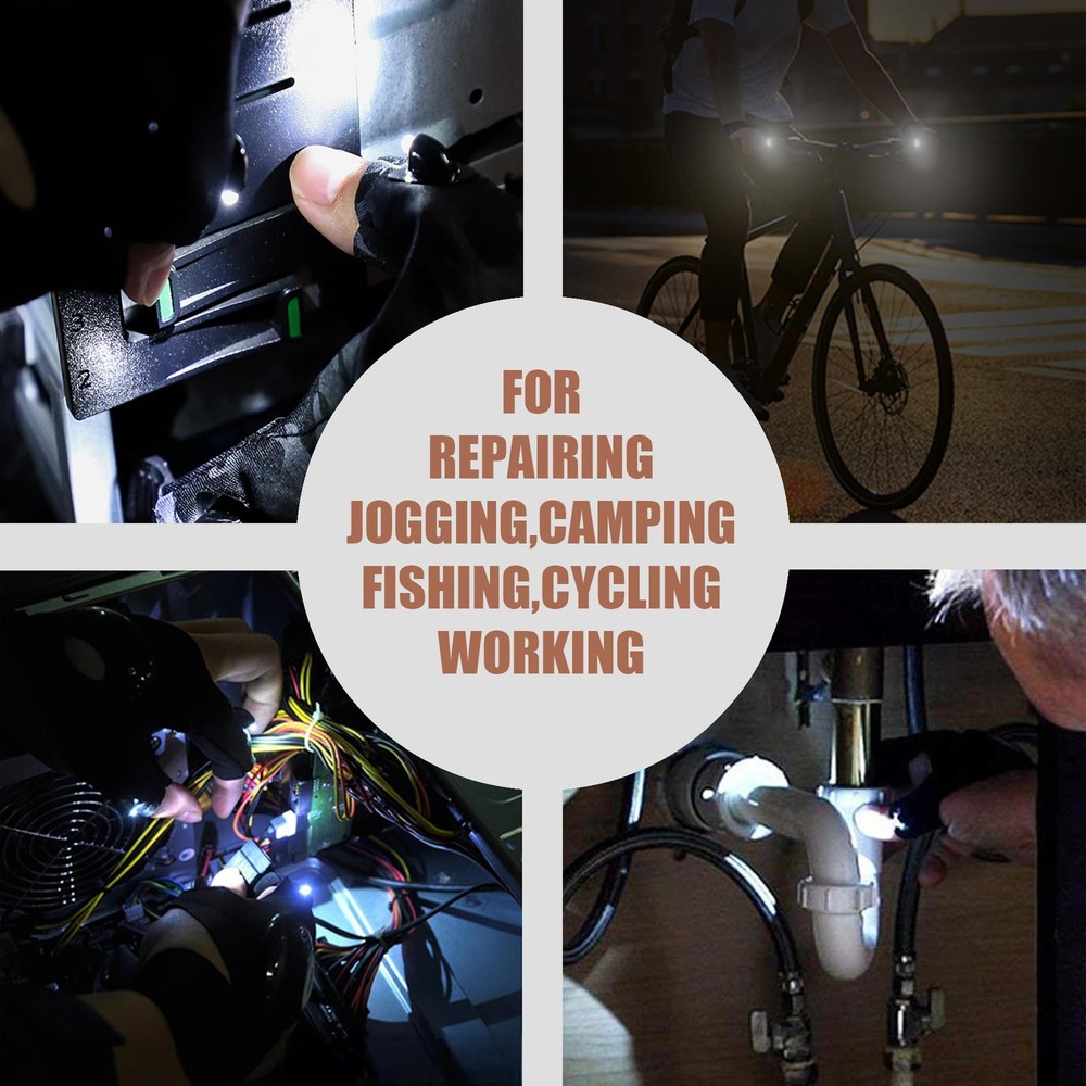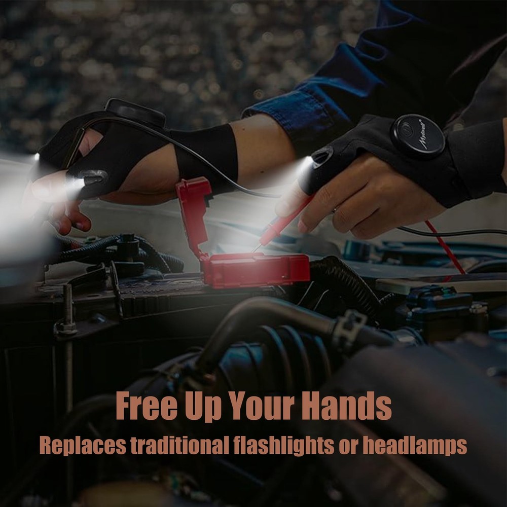 A must have and pretty neat gadget! Are you hate it when your fingers blocked your light? Now problem solved, by using our flashlight gloves, just point to anywhere you want. No more struggling in the darkness to hold a flashlight while repairing something! No more getting frustrated with lighting while busy working on something that requires both hands! A must have tool for fishing lover, gadget lover, crafter, network engineer, plumber, camping, cycling and other outdoor activities, or even playing guitar in clubs, it will absolutely draw attention! Water resistant glove This outdoor fishing glove is not totally waterproof, but there are no problem for just raining or water drop, good for fishing or catch lobster at night. Hands free, don’t need to holding the cage and flash light the same time. Replaced battery Come with batteries installed, ready to use. Battery can be replaced easily by loosen the screw with a screwdriver to open the battery cover, screwdriver is also included. One size fit all hands! Our led flashlight multipurpose glove is made of high quality sturdy from spandex material and it has an adjustable Velcro band for all hand sizes. Multi-purpose Fishing - to replace bait when night fishing Patrol or Law Enforcement - to liberate hands Hiking or Mountain Camping or Cycling - handy help when lack of light Maintenance Equipment or Repairing - a best helper when do with fine parts Other Outdoor Activities Work Lighting Some one who get off work late - In a dark evening or night, when got off work, can easily find your key and open your gate ,door. Package include: 1*Pair of gloves 1* Screwdriver UNIQUE GIFTS FOR MEN : A versatile present for Dad, Mom, husband, boyfriend, DIYer, or handyman—ideal for birthdays, Father's Day, Christmas, and other special occasions. COOL GADGETS FOR MEN : Perfect for dads who love fishing, hiking, mountain camping, cycling, running, or working on cars and handling electrical projects, making outdoor night activities even more enjoyable. ENHANCED VISIBILITY in TIGHT or DARK SPACE : Equipped with 2 powerful LEDs on the index finger and thumb, these gloves provide targeted illumination exactly where you need it. The easy-to-use on/off button on the back ensures quick activation. CONFORT & FLEXIBILITY – ONE SIZE FITS MOST : Made from breathable, stretchable polyester, these handsfree flashlight gloves offer a secure and comfortable fit. Adjustable Velcro straps accommodate most hand sizes. COMPLETE PACKAGE : Includes 4 pre-installed CR2016 button batteries (lasting up to 30 hours) and a screwdriver for effortless battery replacement.
