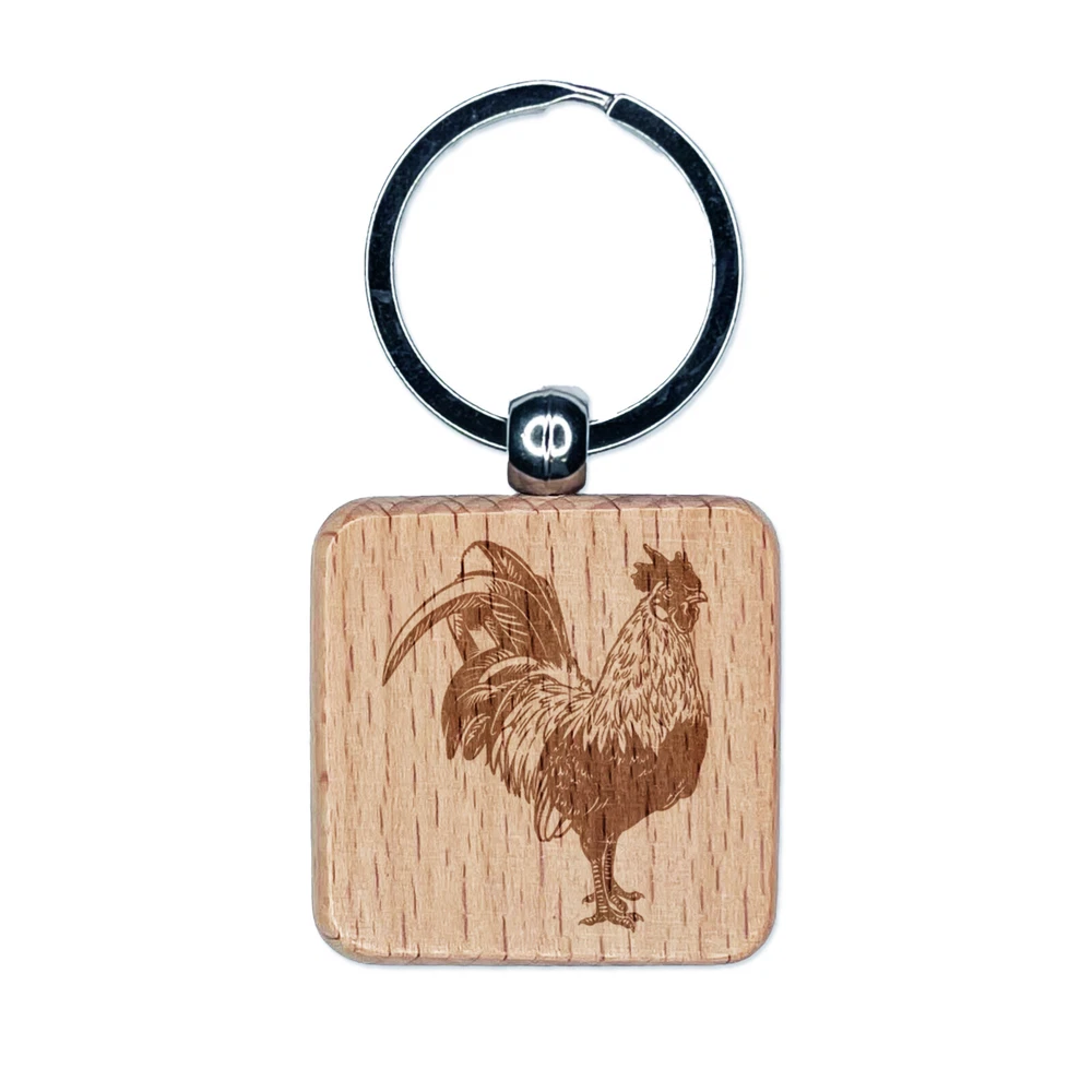 Handsome Rooster Chicken Engraved Wood Square Keychain Tag Charm