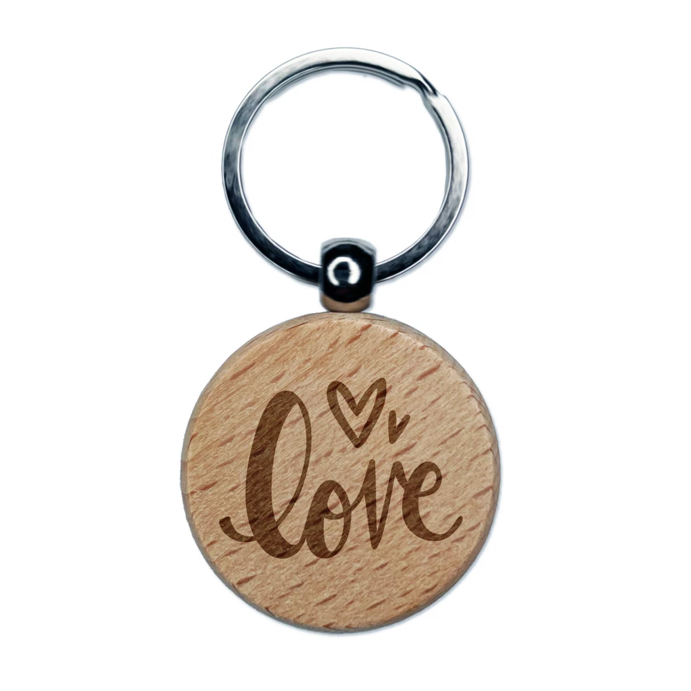 Handwritten Love Script with Hearts Engraved Wood Round Keychain Tag Charm