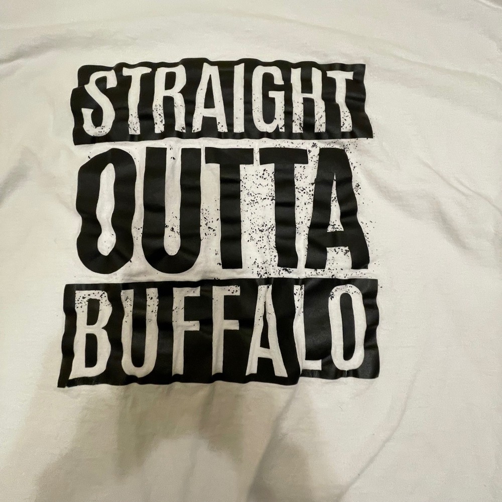 Declare your Buffalo pride with this bold graphic tee! This classic crew neck t-shirt features the iconic "Straight Outta Buffalo" slogan, making it a perfect way to represent your city. The crisp white color provides a clean backdrop for the striking black graphic, ensuring it stands out in any casual setting. Whether you're hitting up a Bills game, exploring Canalside, or just chilling with friends, this tee is a comfortable and stylish way to show your love for Buffalo. Measurements: * Pit to pit: 22 inches * Length: 27 inches Color: White Department: Men Type: T-Shirt Fit: Regular Sleeve Length: Short Sleeve Character: None Pattern: Graphic Print Character Family: Buffalo, Straight Outta Features: Tagless Neckline: Crew Neck Material: Cotton Keywords: Hanes, T-shirt, Graphic Tee, Buffalo, Straight Outta Buffalo, Crew Neck, Casual, Men's Fashion, Streetwear, White T-shirt, XL, Extra Large, Buffalo NY, New York, City Pride The Designer Clothing Exchange "Great Brands, Great Prices" - NEW ITEMS DAILY 5 STAR SELLER - FAST SHIPPING DAILY - AMBASSADOR II