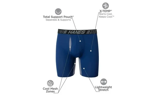 Elevate your everyday comfort with Hanes Men's Long Leg Ultimate Comfort Total Support Pouch Boxer Briefs, available in a convenient 3-pack. Designed with innovative X-Temp technology, these boxer briefs start cool and adapt to your body temperature, ensuring you stay comfortable all day. The advanced moisture-wicking fabric, combined with odor protection, keeps you feeling fresh during any activity. Featuring a patented breathable mesh liner, these boxer briefs provide optimal support and prevent chafing, making them an essential addition to your wardrobe. Crafted for the modern man, Hanes Total Support Pouch Boxer Briefs prioritize comfort without sacrificing style. The tagless design eliminates itching, while the Comfort Flex waistband and long legs ensure everything stays in place. With targeted mesh zones for enhanced airflow and a lightweight stretch fabric that moves with you, these boxer briefs are perfect for both daily wear and active pursuits. Experience the ultimate in comfort and support with Hanes—your go-to choice for men's underwear. Key Features: X-Temp Technology: Adapts to temperature and activity for all-day comfort. Breathable Mesh Liner: Prevents chafing by providing support and separation. Moisture-Wicking Fabric: Keeps you dry and fresh during daily activities. Odor Protection: Advanced technology helps maintain freshness. Tagless Design: Eliminates itching for enhanced comfort. Targeted Mesh Zones: Provides cooling where you need it most. Comfort Flex Waistband: Stretches for a secure fit that stays in place. Lightweight Stretch Fabric: Moves with you for ultimate flexibility. Convenient 3-Pack: Offers value and variety for everyday wear.