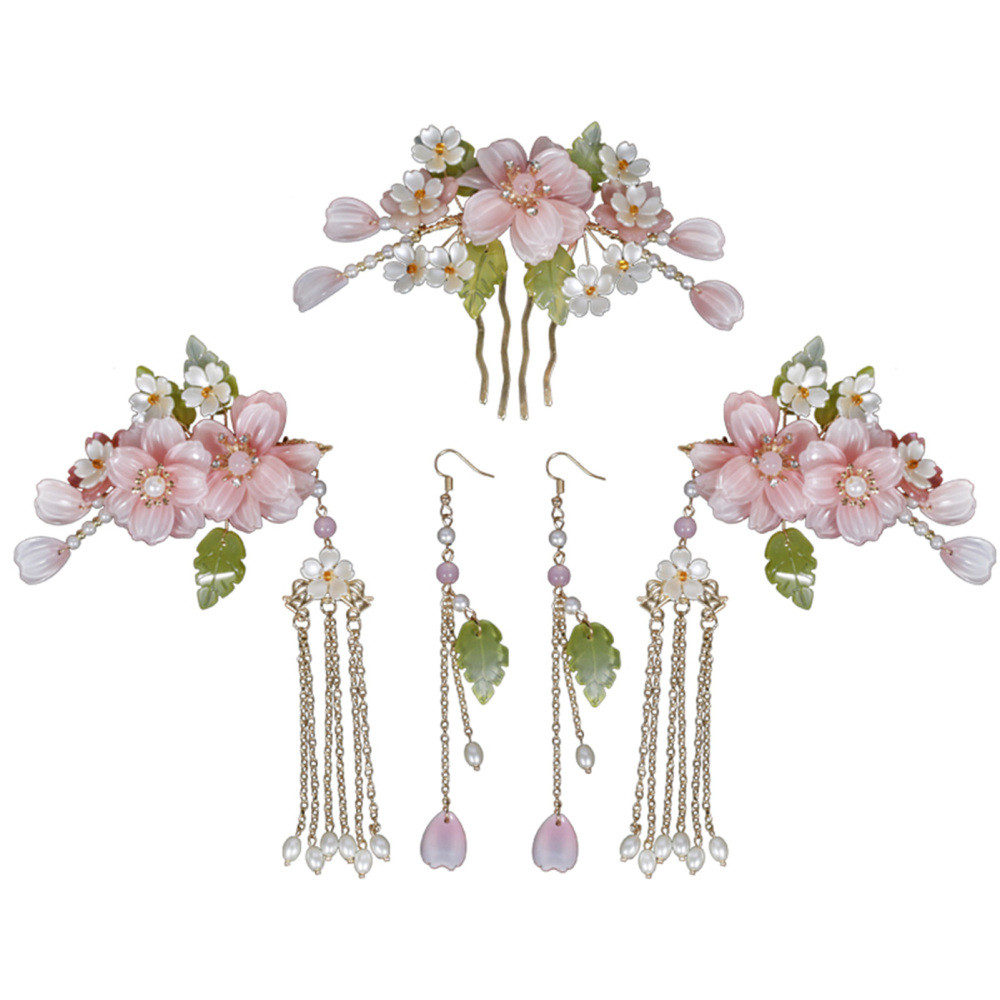 Features: Exquisite Hanfu Headwear Hair Jewelry: Enhance your Hanfu style with this stunning set of flower hair jewelry made specifically for women. The intricate design features pink and white flowers, complemented by green leaves, creating a beautiful headdress that adds elegance to any outfit. Versatile Hair Jewelry Headwear Set: This set includes a side hair comb, hair clip, and earring headwear, allowing you to create various styles and combinations. Whether you're attending a cosplay party, wearing a Chinese cloth Cheongsam, or simply looking for a unique accessory, this set has got you covered. Retro Charm with a Modern Style: The long tassel gentle color retro head ornament exudes a sense of vintage while incorporating modern elements. Its unique design and vibrant colors make it a perfect matching for Hanfu style clothes, adding a touch of sophistication to your overall look. Ideal Gift for Friends, Girlfriend, or Wife: Surprise your loved ones with this novel gift that combines traditional Chinese aesthetics with contemporary fashion. Perfect for birthdays, anniversaries, or special occasions, this headwear set is sure to make a lasting impression. Premium Quality and Craftsmanship: Each piece of hair jewelry is meticulously crafted with attention to detail, ensuring durability and longevity. Made from quality materials, this headwear set is designed to withstand daily wear and tear, allowing you to enjoy its beauty for years to come. Specification: Material: Alloy, imitation pearl, glass/coloured glaze Gender: Women Notes: 1. Due to the lighting effects and shooting angles, there is a color difference in the product, please understand. 2. Due to manual measurement, there is a tolerance in the product size.