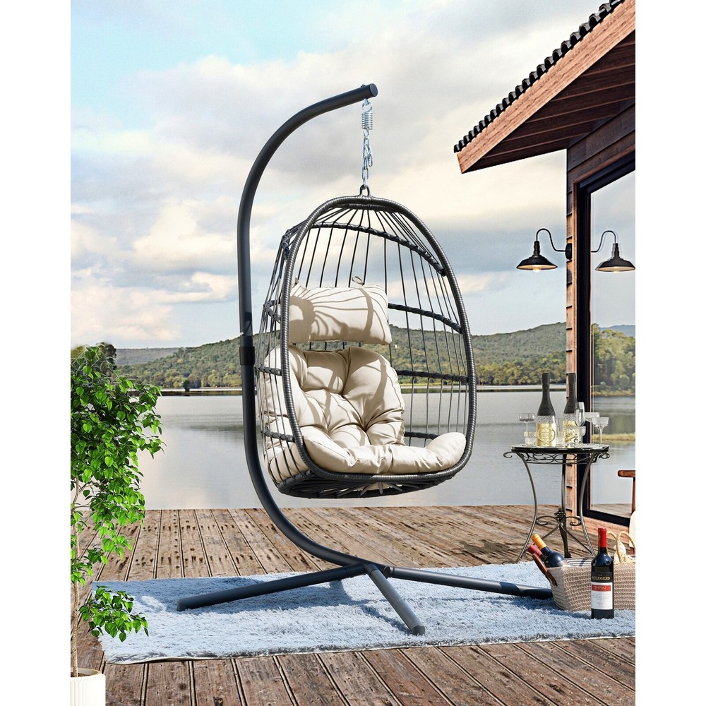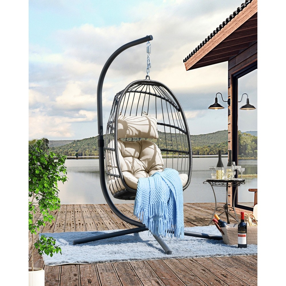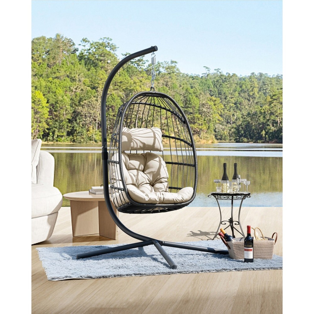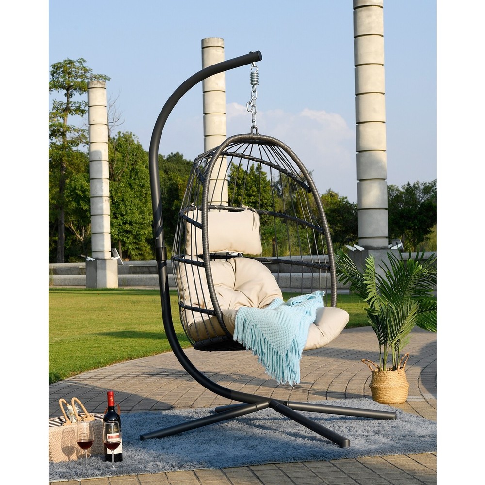 Have a great time with this swing chair! The folding swing chair is made of durable PE wicker twine and heavy-duty steel frame, making it durable. In addition, the soft pillows and seat cushions with fixed ropes provide you with a comfortable sitting feeling, and the versatile appearance makes this folding swing chair suitable for a variety of scenes, such as bedrooms, living rooms, and terraces. Features: Thickened pillow and cushion for a cozy sitting. Fixed ropes avoid the cushions to move around. Swing chair is made of polyethylene rattan resin wicker wrapped around a steel frame to increase the strength and durability of the product, Powder-coated steel pipes are rustproof and sturdy,quick folding design it can be placed outdoors for a long time. This swing chair comes with a Free Shipping Over $49.99* Details Swing Chair with Stand Product Description: Have a great time with this swing chair! The folding swing chair is made of durable PE wicker twine and heavy-duty steel frame, making it durable. In addition, the soft pillows and seat cushions with fixed ropes provide you with a comfortable sitting feeling, and the versatile appearance makes this folding swing chair suitable for a variety of scenes, such as bedrooms, living rooms, and terraces. Features: Thickened pillow and cushion for a cozy sitting. Fixed ropes avoid the cushions to move around. Swing chair is made of polyethylene rattan resin wicker wrapped around a steel frame to increase the strength and durability of the product, Powder-coated steel pipes are rustproof and sturdy,quick folding design it can be placed outdoors for a long time. This swing chair comes with a sturdy, rust-resistant stand, so you no longer have to worry about whether the various stands you buy online or offline will match. The stand has a weight capacity of 250 lbs. Specification Material Metal; Wicker/Rattan Upholstery Material Polyester Blend Weight Capacity 350 lb. Overall 73.62'' H X 35.43'' W X 39.76'' D Overall Product Weight 45 lb.