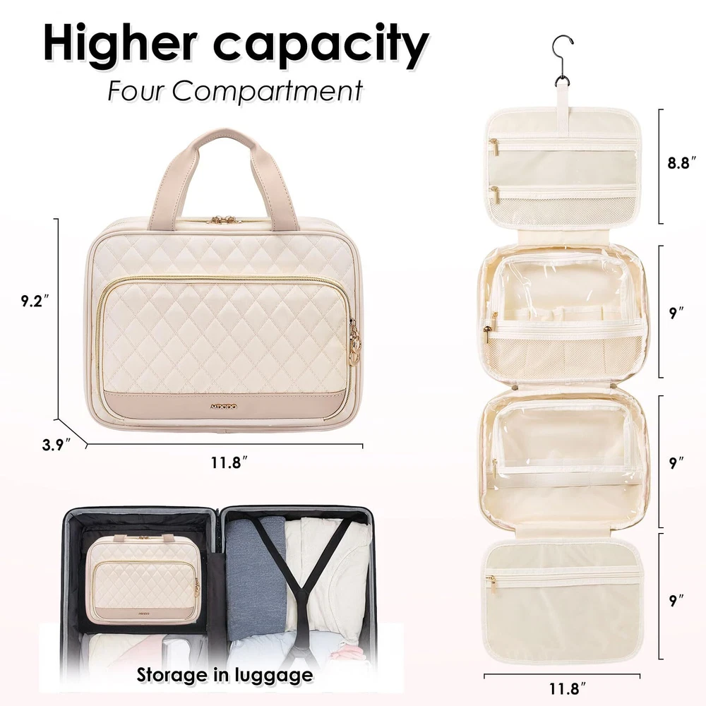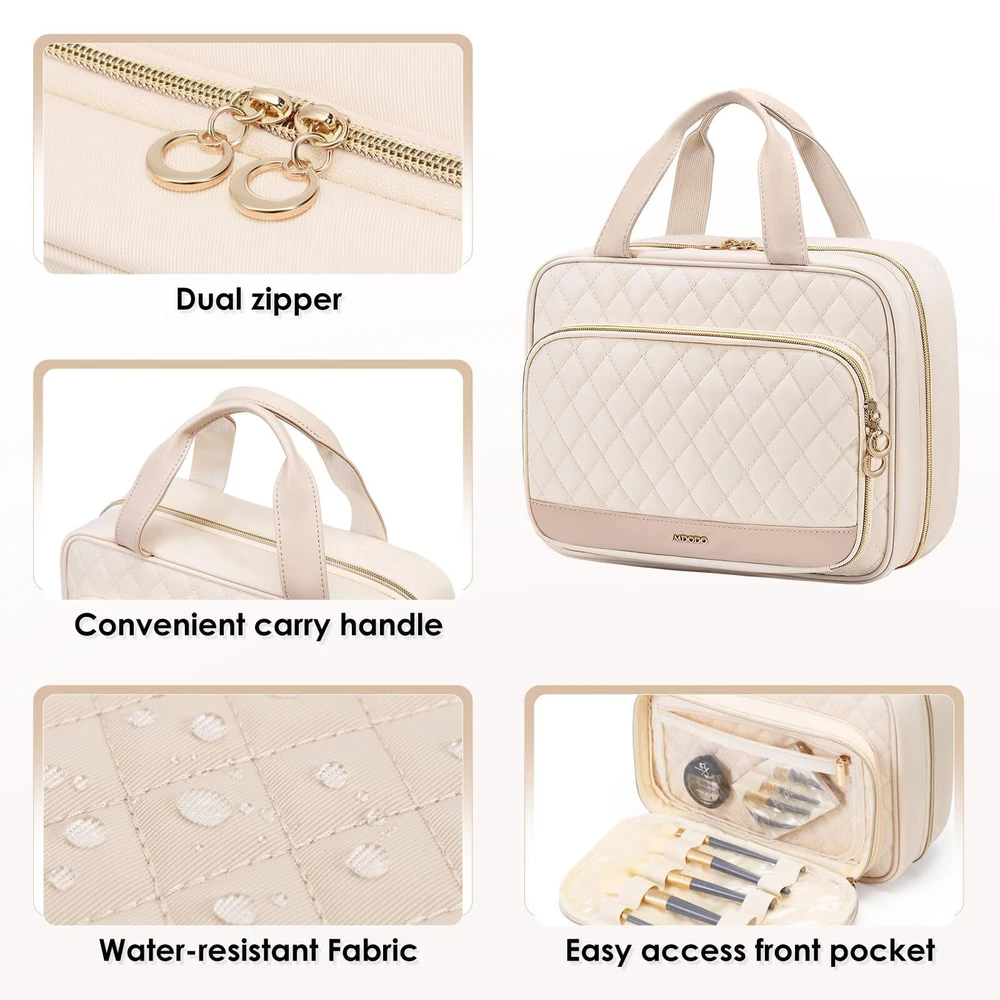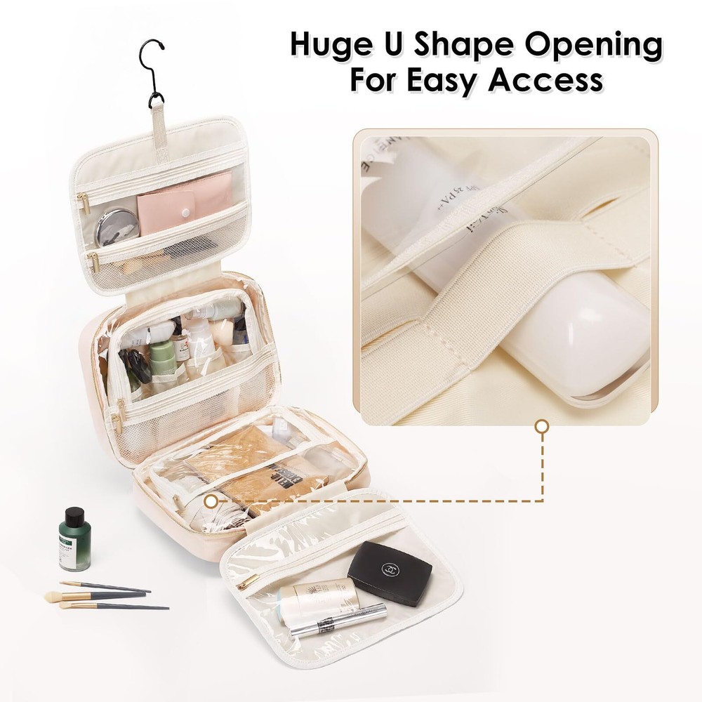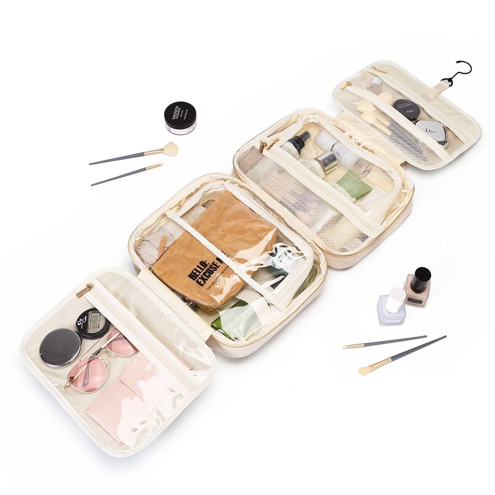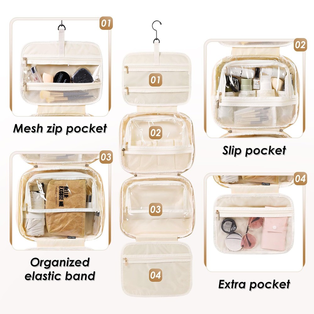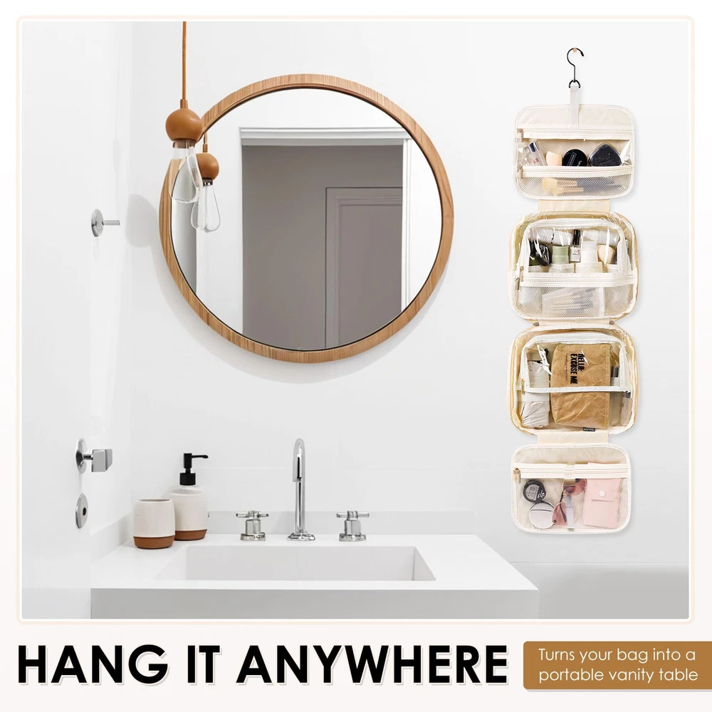 MDODO Travel Toiletry Makeup Bag for Women Hanging Toiletry Bag Cosmetic Organizer Make up Bags for Women Travel Essentials (Beige) Hanging Design: Our makeup organizer bag can stow-away 360-degree swivel non-slip metal hook for versatile hanging options; cosmetic bag carry handle doubles as its hanging strap; two-way zipper closure for quick access Travel Essentials: This hanging travel toiletry bag is perfect for business trips, travel, camping, and family outings. You can also make a good choice to use as a present for women, BFFs, friends, and family for various occasions like birthdays, Christmas Day, and Valentine's Day Easy to Carry: MDODO Makeup travel bag dimension: 11.8L*9.3H*3.9D inches (rolled), Weight: 1.36 lbs, lightweight and easy to carry, great for overnight staying, a long journey, gym shower, and outdoor activities.We add brush organizer compartment in the front pocket of travel make up bag for various makeup brush, meeting your travel toiletries and makeup needs Large Capacity Travel Must Haves: MDODO makeup bag has 5 separate compartments inside the travel makeup bag to keep all your items organized.Inner main pockets with elastic straps hold bottles upright; this travel toiletry bag design double zipper compartment for easy access to the items even not fully open the bag; Transparent sides for providing clear overview of contents. Space-efficient toiletry/make up bag hold your full-sized essentials, lotions, shampoo, powder foundation Water-resistant and Easy to Clean: MDODO toiletry bag for women is made of water-resistant Polyester with supple touch; Segment dry and wet stuff-clear pockets combines with mesh compartment. Neat and organized. Not worry colored liquid will ruin the toiletry bag any more. Different size elastic straps fit for sizes of bottles. This toiletry travel bag can hold many items with sturdy stitching and heavy-duty material. Well-padded design to keep full bag's shape and provide great protection SHIPPING Domestic Buyers - We have confidence in our products, but if you are not fully satisfied please contact us within 30 days of purchase and you will get full refund. - We ship within 3 business days of payment, usually sooner - We offer FREE shipping on all orders! - We only ship to the lower 48 states, no APO/FPO addresses or PO Boxes allowed International buyers – please note: Import duties, taxes, and charges aren't included in the item price or postage cost. These charges are the buyer's responsibility. - Please check with your country's customs office to determine what these additional costs will be prior to bidding or buying. * Order Cancellation Policy ** You can return a product for up to 30 days from the date you purchased it. 1. The seller reserves the right to cancel the special case only due to eBay cancellation fee. 2. The decision of seller is the final. 3. The seller will respond to the cancellation request within 2 business days. Please wait for the result of cancellation. 4. In case the cancellation is not completed by some reasons, the buyer can follow the options below to get the refund. 4.1 The buyer can reject the item when it arrives. 4.2 The buyer can send the item back to the seller within 30 days If the buyer receives item (USA Shipment ONLY). The seller will provide the FREE return label to the buyer when the buyer opens " Return Item" case on eBay by using the reason as "Change my mind" ONLY. 5. When buyer has placed the order. The order will be processed and completed by automatic warehouse system within 5 minutes. In case that buyer sends the cancellation request after 5 minutes of placing the order, the request will be rejected. **Sending direct message to cancel the order is not allowed for every case.* Return Policy For the return case - If buyer would like to return the items for refund or replacement, please CONTACT SELLER to receive the free return label from seller. The refund or replacement will be processed with the tracking number of return label which is provided by seller only. The other ways of return which are not approved by seller will not be processed for the refund or replacement.